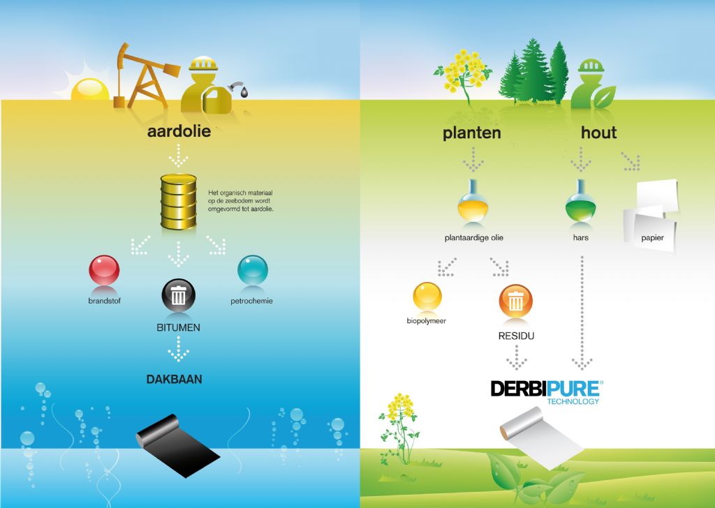 Een vraag die Derbigum zich ook al gesteld heeft, en zich op voorbereid heeft. Zo werd in 2010 de wit reflecterende dakbaan Derbipure® op de markt geïntroduceerd. De eerste dakbaan waar geen druppel bitumen aan te pas kwam, maar waarvoor speciaal een mengsel van plantaardige oliën en harsen ontwikkeld werd. Tot op heden nog altijd de enige dakbaan ter wereld op plantaardige basis en een volwaardig alternatief voor bitumineuze roofing.