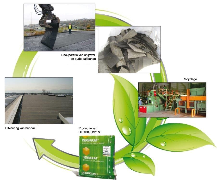 Om de eindklant mee in het circulair traject te krijgen, stelt Derbigum ondertussen ook, voor bepaalde werven met de Derbigum NT-producten, een terugnamecertificaat voor. Met deze werkwijze garandeert Derbigum aan zijn klant de volledige terugname van de bitumineuze roofing wanneer het dak, aan het einde van zijn levensduur, gerenoveerd wordt en het nodig is om de bestaande dakbanen van het dak halen.