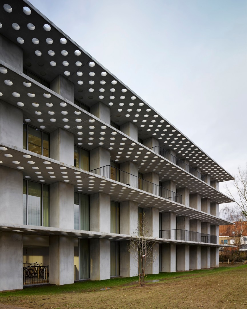 Toch werd de bestaande structuur uiteindelijk deels ontzien in het nieuwe gebouw. De architecten van OFFICE Kersten Geers David Van Severen kozen er in hun ontwerp, waaraan ook hp engineers (studie technieken), Bureau Bouwtechniek (projectondersteuning en EPB-advies en -verslaggeving) en Landinzicht Landschapsarchitecten (omgevingsaanleg) hun bijdrage hadden, immers voor een slanke onafhankelijke prefabbetonstructuur van kokers en luifels met daarop hier en daar balkons te ontwerpen rond de bestaande structuur. De betonkokers, 12 cm dik, hebben een eigen fundering en dienen om de luifels en balkons, elk 16 cm dik, te dragen. De nieuwe structuur uit geprefabriceerd architectonisch beton is slechts horizontaal verankerd aan het bestaande gebouw.