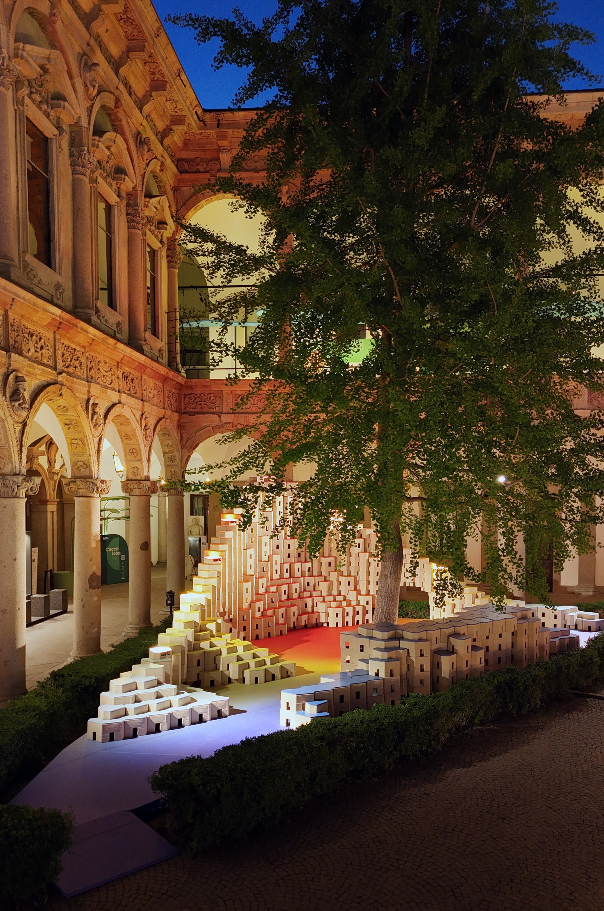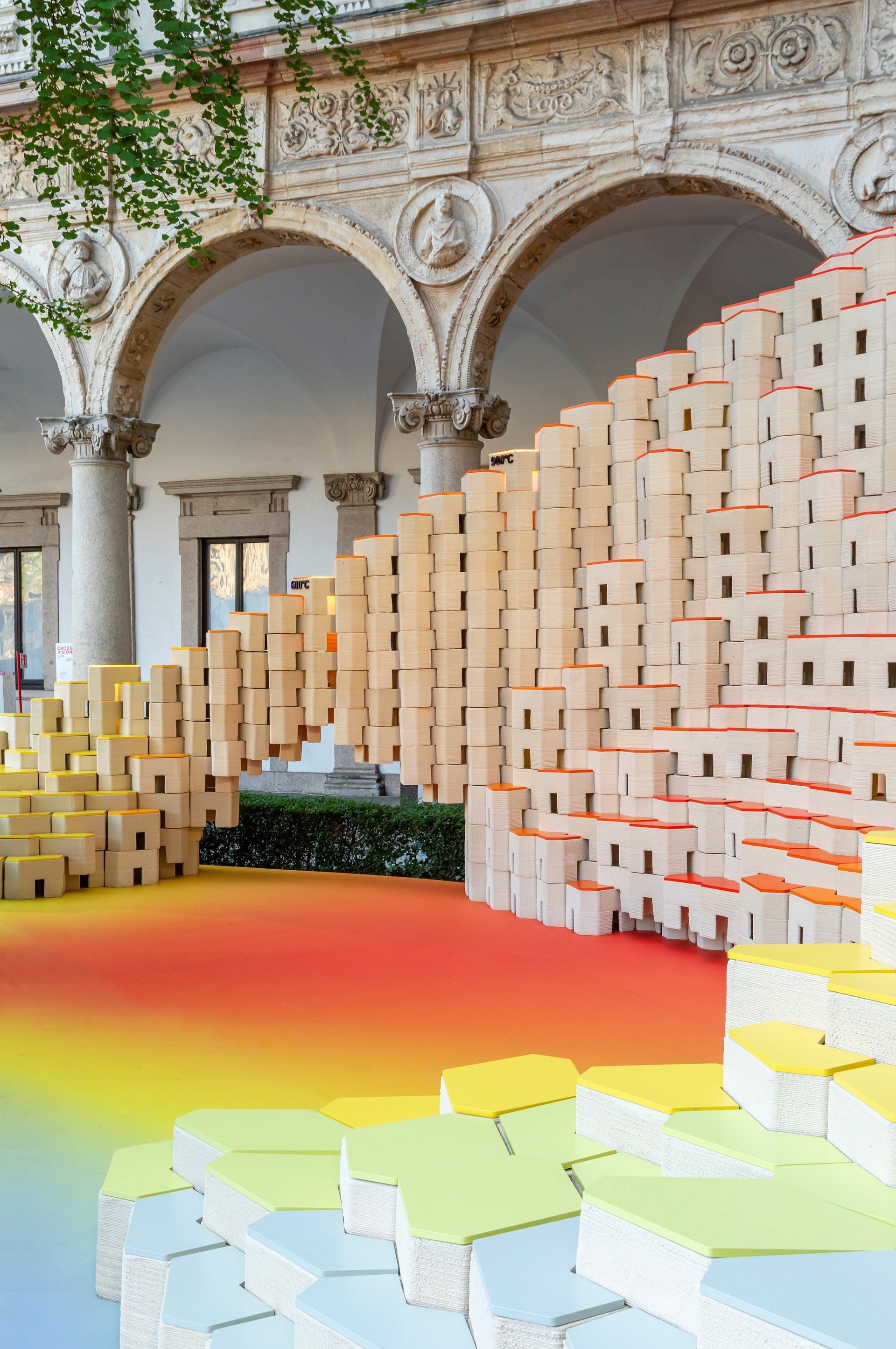 Het elegant gebogen ontwerp van de installatie verschillende hoogtes past perfect in het driehoekige perceel en gaat moeiteloos op in de binnenplaats van de Universiteit van Milaan en biedt een scala aan ruimtelijke en functionele mogelijkheden. Deze veelzijdige blokken zijn niet alleen visueel aantrekkelijk, ze worden ook onderdeel van het verhaal en veranderen in uitnodigende zitgedeeltes die bezoekers aanmoedigen om te ontspannen, gesprekken te voeren en te socialiseren in deze dynamische ruimte.