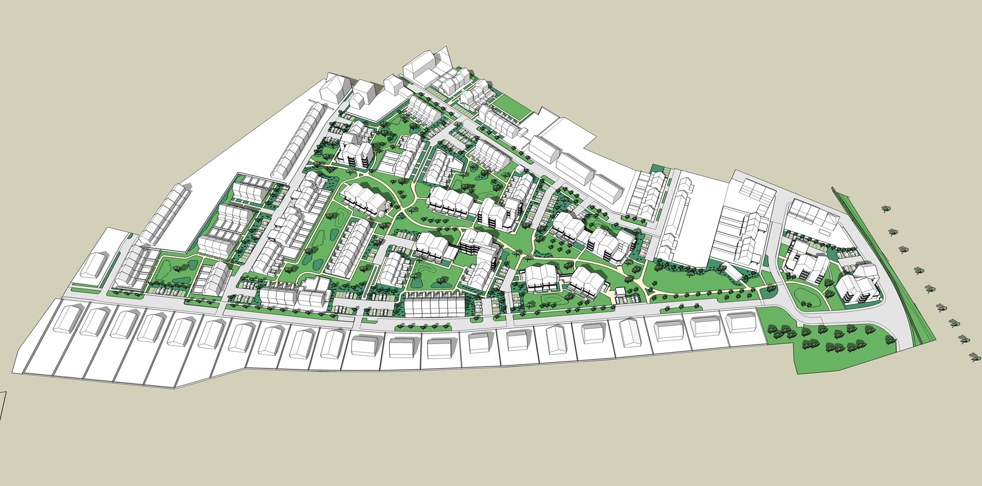 Door de noord-zuid verbindingen en het oost-west park ontstaan een reeks bouwvelden. Deze bouwvelden kunnen gefaseerd gerealiseerd worden en geven de mogelijkheid om diverse typologieën te mixen. Zo worden gericht naar het park enkele meersgezinswoningen voorzien, terwijl de andere randen met grondgebonden typologieën worden gemaakt. Elk bouwveld organiseert zich rond een binnenhof, een groene collectieve ruimte.