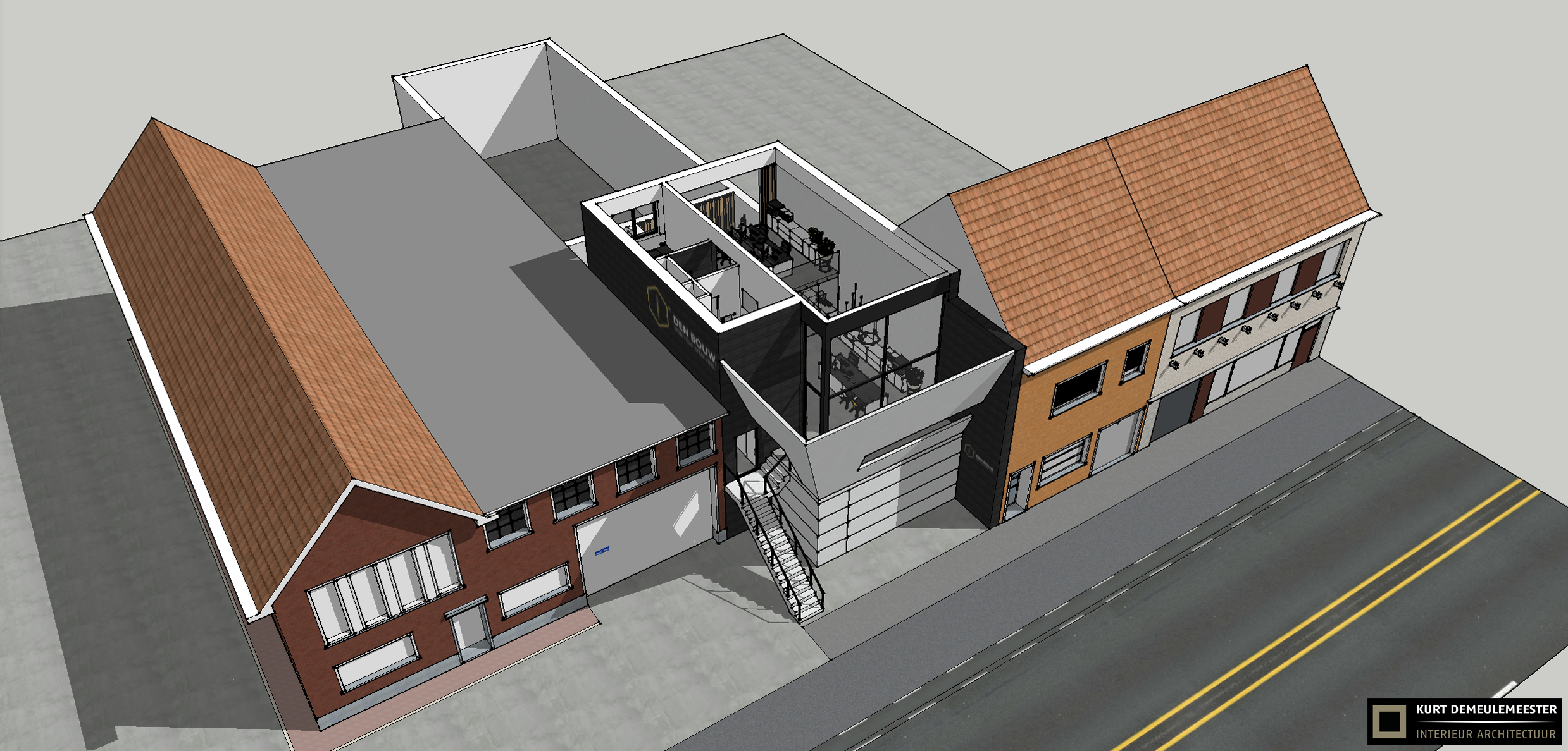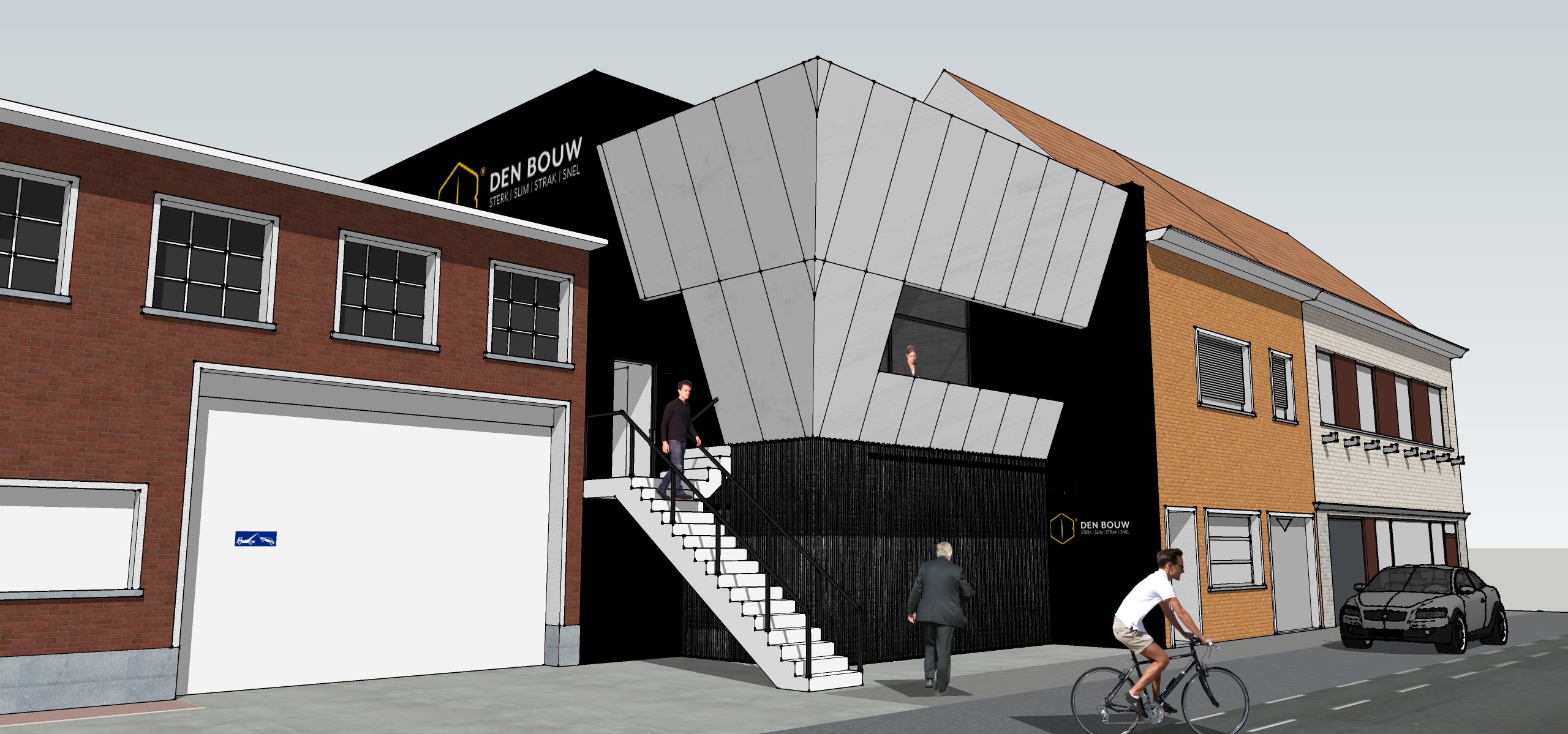 In opdracht van Den Bouw Realisaties ontwierp interieurarchitect Kurt Demeulemeester zijn project Den Buro in Wevelgem. Het doel was om een bureelgebouw met achterliggende loods die opvalt in het drukke straatbeeld, voorzien van extra ruimte voor co-working, te creëren. De onderliggende gedachte van het project is dan ook ‘When business meets pleasure’.