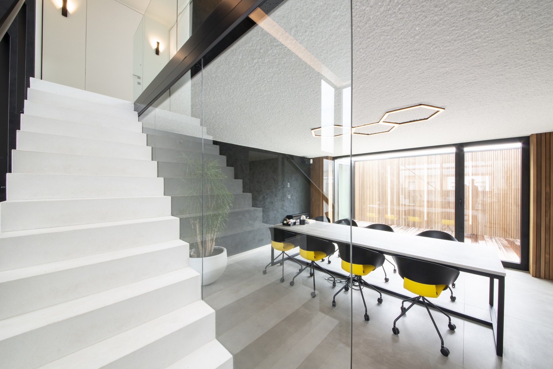 Omwille van de witte betonnen buitentrap die als toegang én eyecatcher fungeert, werd bewust niet gekozen voor een onthaal. Je komt binnen in de grote ruimte waar iedereen aanspreekbaar is en onmiddellijk word je ondergedompeld in de open bedrijfscultuur die er gecreëerd wordt.