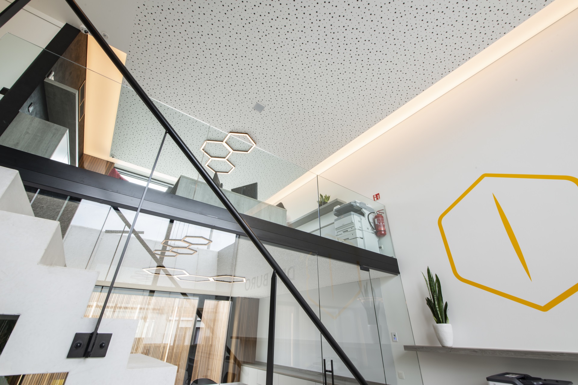 Opvallende materialen die gebruikt werden zijn onder meer akoestische gyproc plafonds, op maat gemaakte verlichting in de vorm van het bedrijfslogo, witte betontrappen in de massa gekleurd en licht doorlatende spanplafonds.