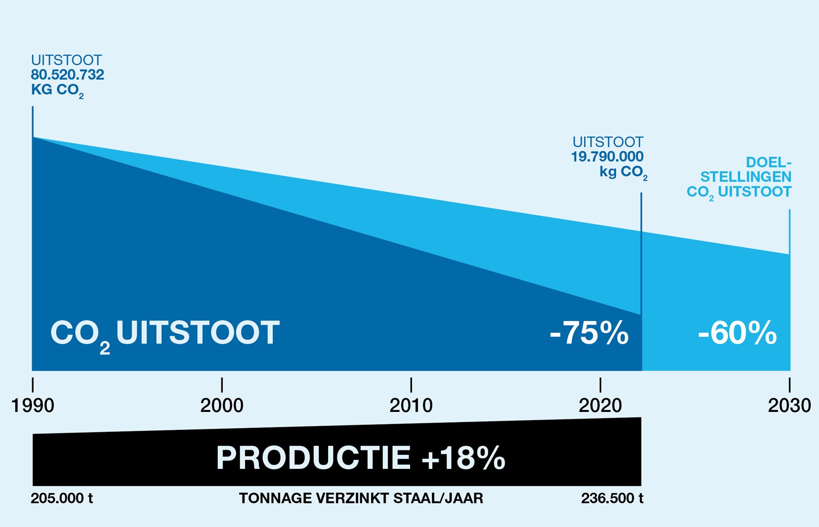 In 2022 werd de uitstoot vastgesteld op 19.790.000 kg CO₂, wat neerkomt op een reductie van 75% ten opzichte van 1990. Dit resultaat is bijzonder indrukwekkend, gezien de groei van de hoeveelheid verzinkt staal van 205.000 ton in 1990 naar 236.500 ton in 2022 (+18%).