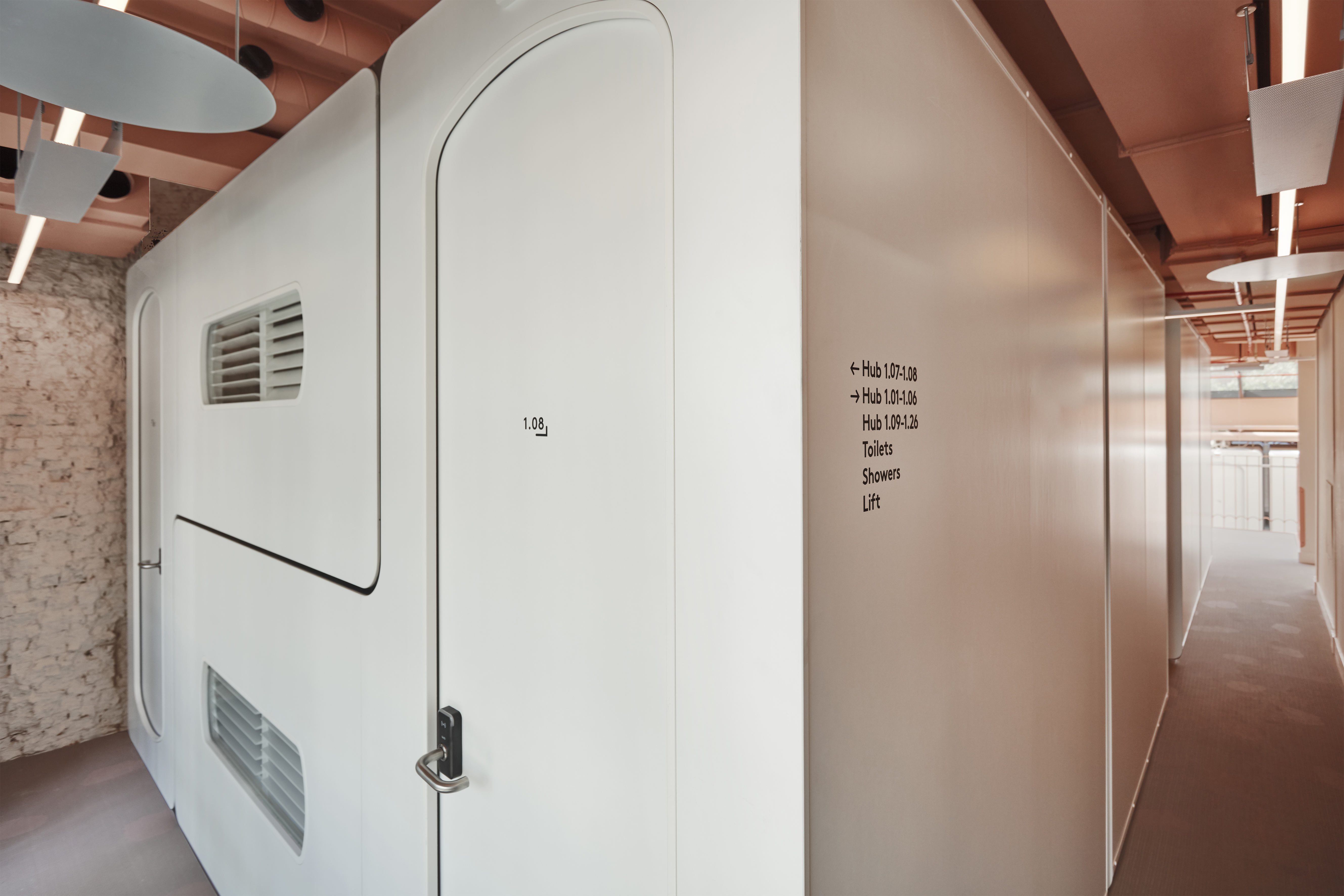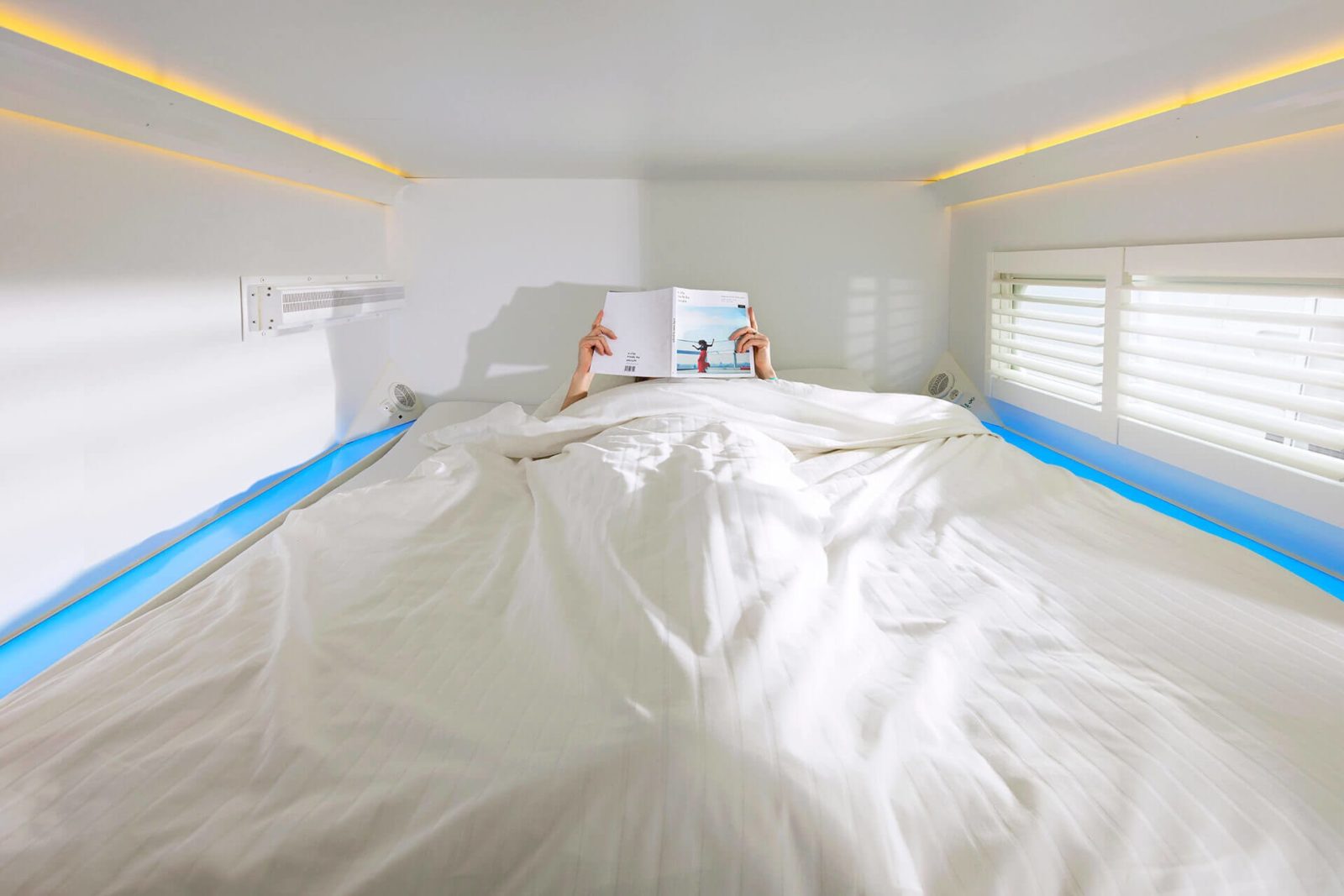 Terwijl de benedenverdieping bruist van de sociale activiteit, blinken de hubs uit in eenvoud en rust. Een kleine instapruimte met beperkte opbergplaats en een beddenbak. That’s it. Strak, wit, proper en rustgevend. En de technologie, die staat uiteraard op punt. Via bluetooth kan je een kleine ingebouwde speaker aan het hoofdeinde van het bed koppelen aan een smartphone of laptop. Ideaal om muziek te luisteren of gezellig een film te kijken. Opvallend is de geïntegreerde en steeds van kleur veranderende verlichting langs de zijkanten van het bed. Te kleurrijk voor jou? Geen probleem, via de app op de smartphone kan je zowaar de verlichting tot in de puntjes afstellen.