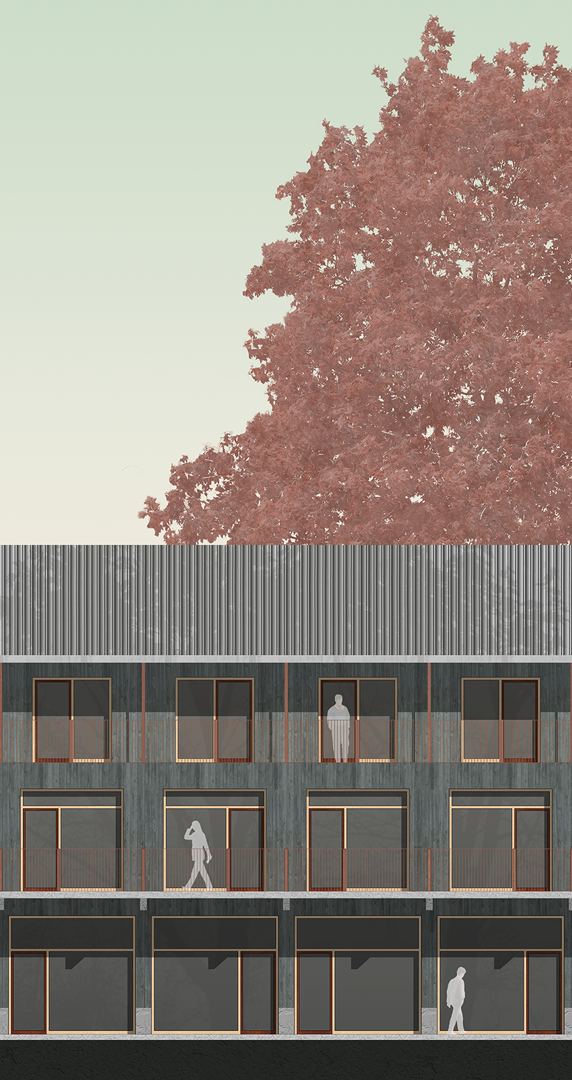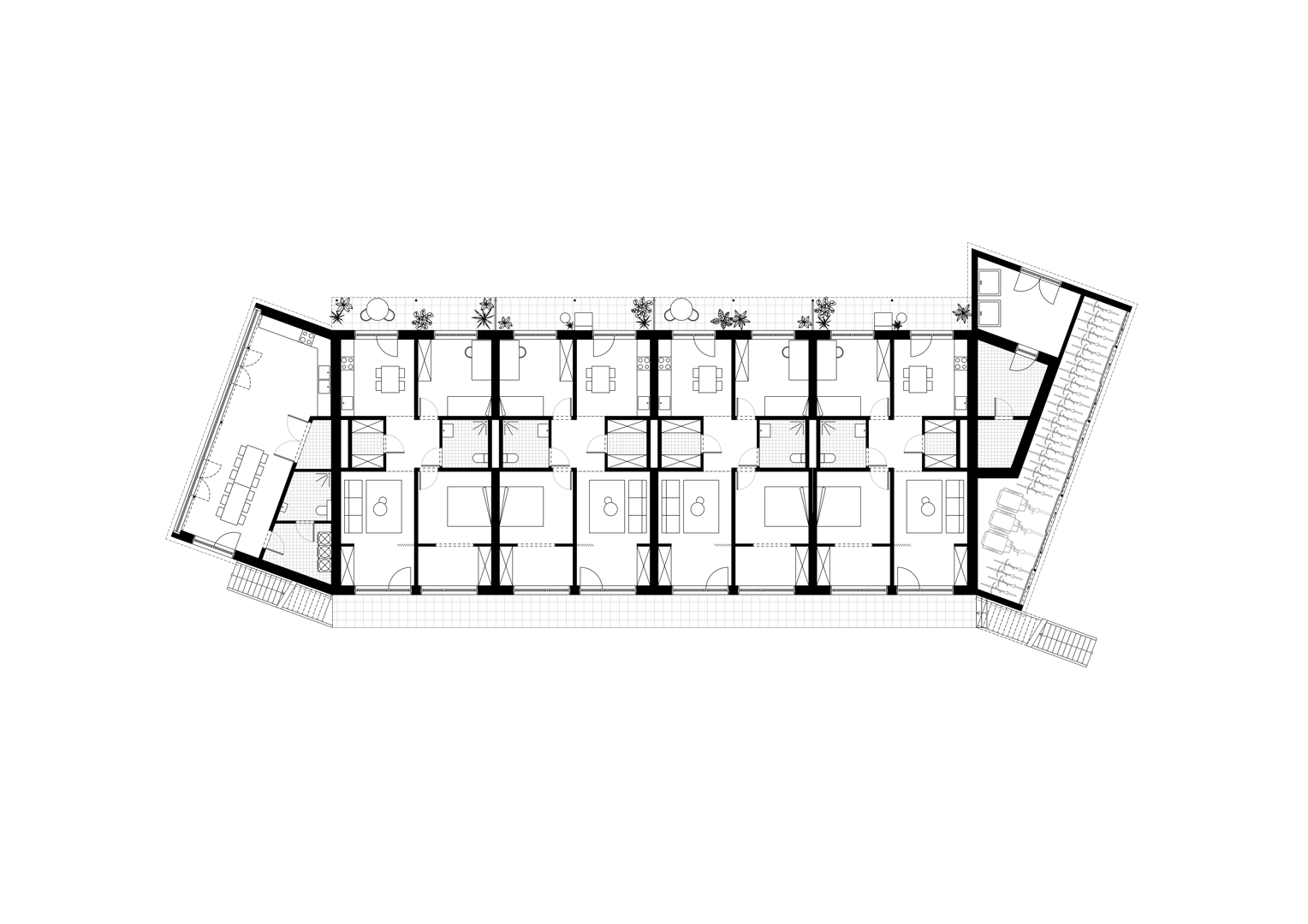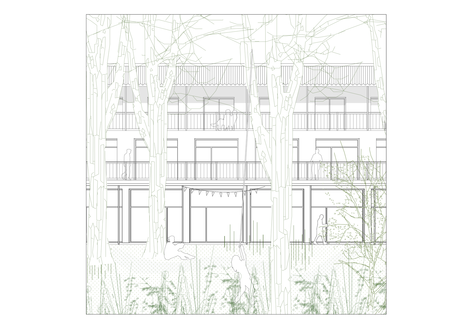 Een bijzonder aspect van Dikken Eik zijn de vier ‘studio’s’ die gekoppeld zijn aan de duplexwoningen. Deze zijn apart ontsloten en kunnen functioneren als semi-autonome units. Dankzij een eigen toegang en een afzonderlijke deur naar de badkamer kunnen ze ingezet worden als zorgunit, studentenkamer of gedeelde woningcomponent. Ook gebruik als atelier of praktijkruimte behoort tot de mogelijkheden. Zo ontstaat een flexibel woonmodel dat inspeelt op verschillende levensfasen en samenlevingsvormen.