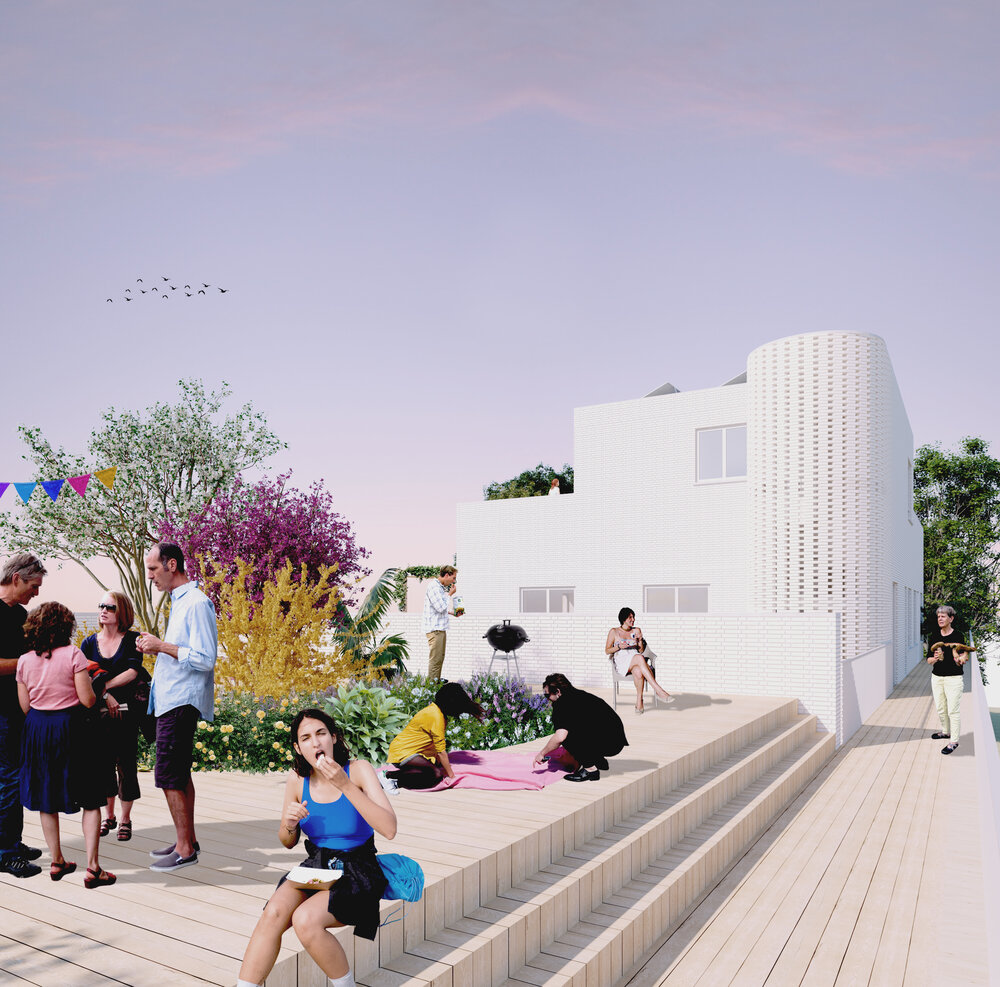 De passerellen aan de noordoostzijde vormen een extra buitenruimte bij de units en beperken de circulatie tot één stijg- en daalpunt in het project wat heel kostenefficiënt is. Het landschap wordt speels vormgegeven met groene trappen, hellingen en een grote diversiteit aan beplanting.