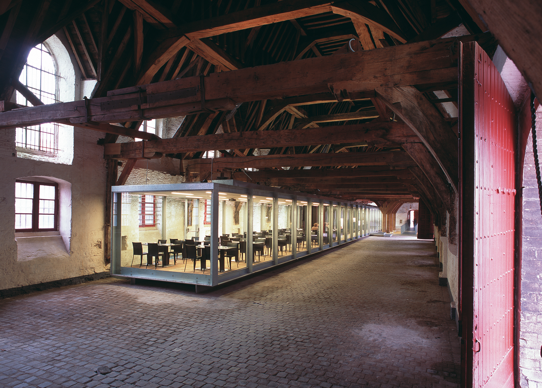 Misschien moeten we gewoon wat meer respect tonen voor de schouders waarop we staan. Was het al niet deel van de Vlaamse architectuurgeschiedenis, dan toch zeker van de recente herbestemmingsgeschiedenis. Dat Coussée en Goris architecten in hun praktijk complexloos ontwerpen voor erfgoed en nieuwbouw afwisselden, was toen ongezien. De ontwerpkwaliteit van de glazen structuur en de manier waarop het zich inpaste in de oude hal was dat evenzeer. Het project bewees dat het kon: van een erfgoedproject een interessant architectuurproject maken maar ook een beschermd gebouw met een hedendaagse toevoeging toch volledig in zijn waarde laten. De maatvoering, de ritmering, het materiaalgebruik en de detaillering, in dit alles zocht de box subtiel de dialoog met het bestaande. Blijkbaar zijn we dit intussen zo evident gaan vinden, dat we het niet meer zien.