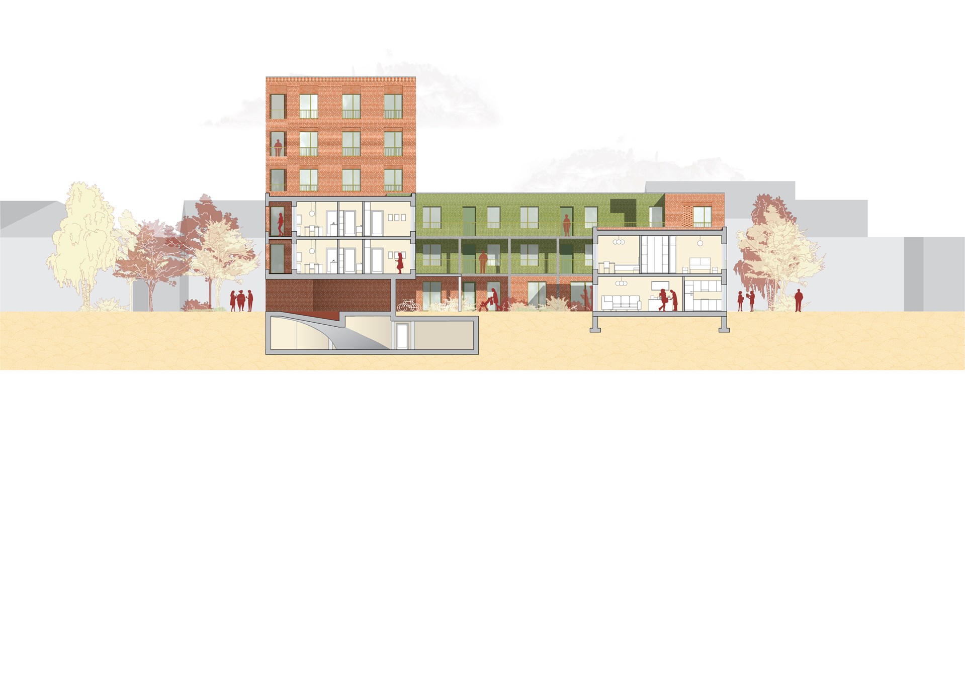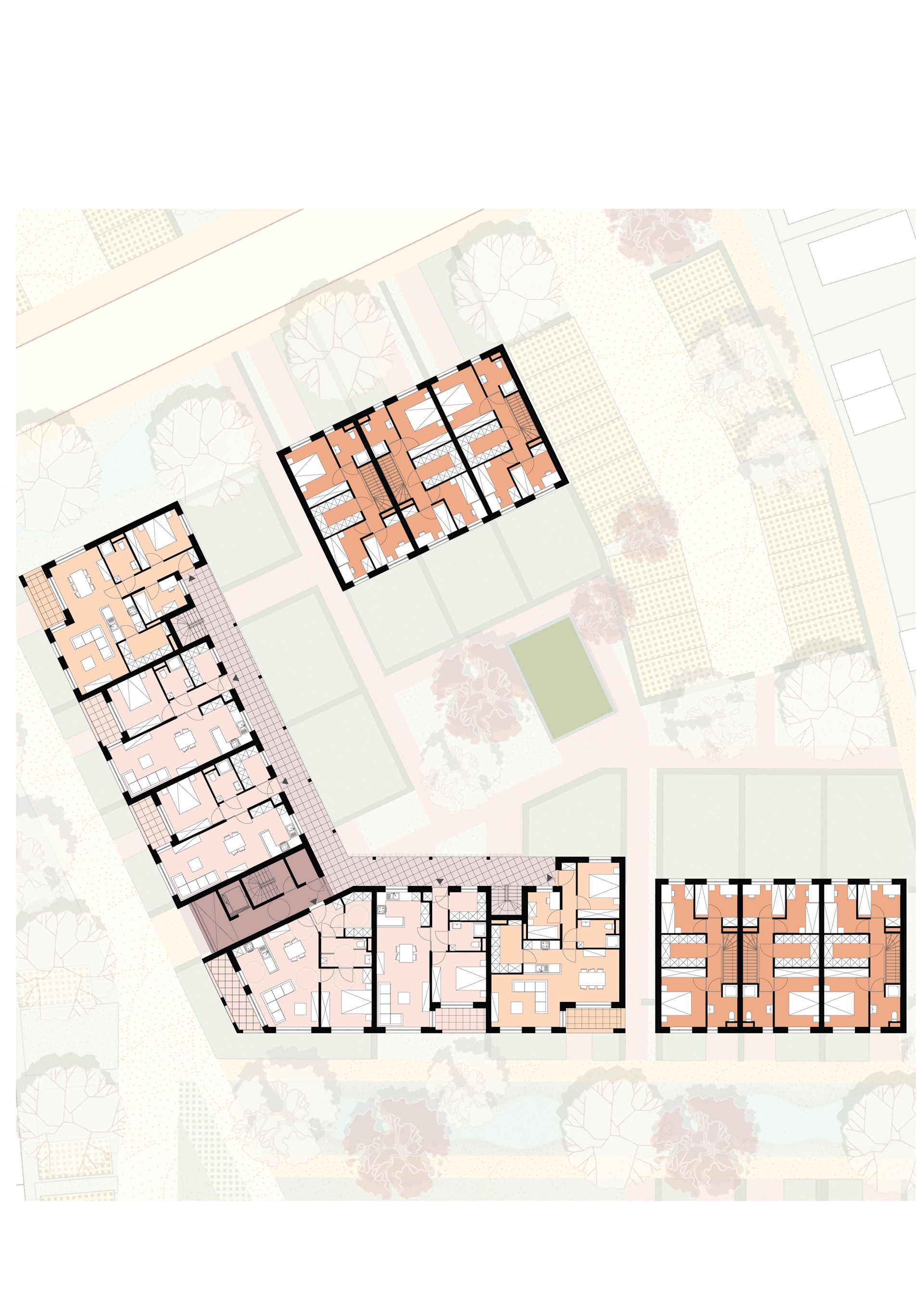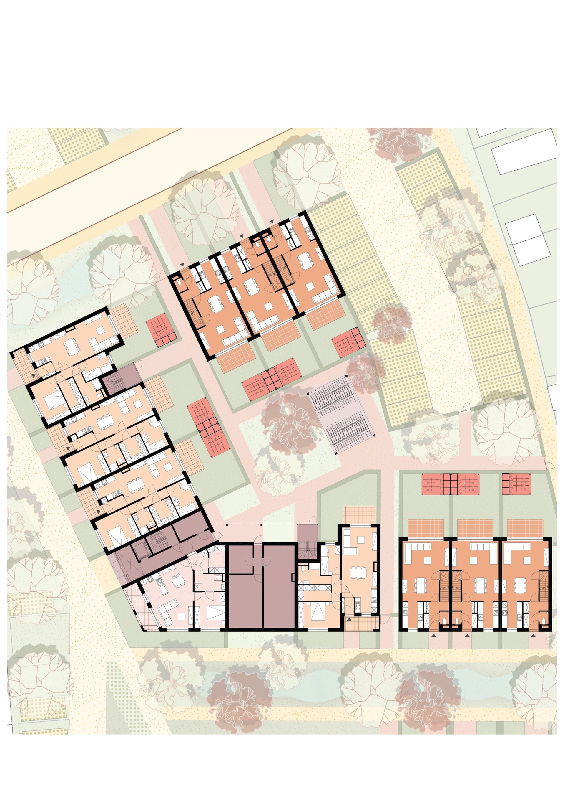 De invulling van de bouwvolumes creëert een divers woningaanbod. Door de invulling van de bouwvelden ontstaat een combinatie van appartementen en grondgebonden woningen. Deze diversiteit aan woningtypes resulteert in een diversiteit aan toekomstige bewoners en vergroot mogelijk het sociaal contact.