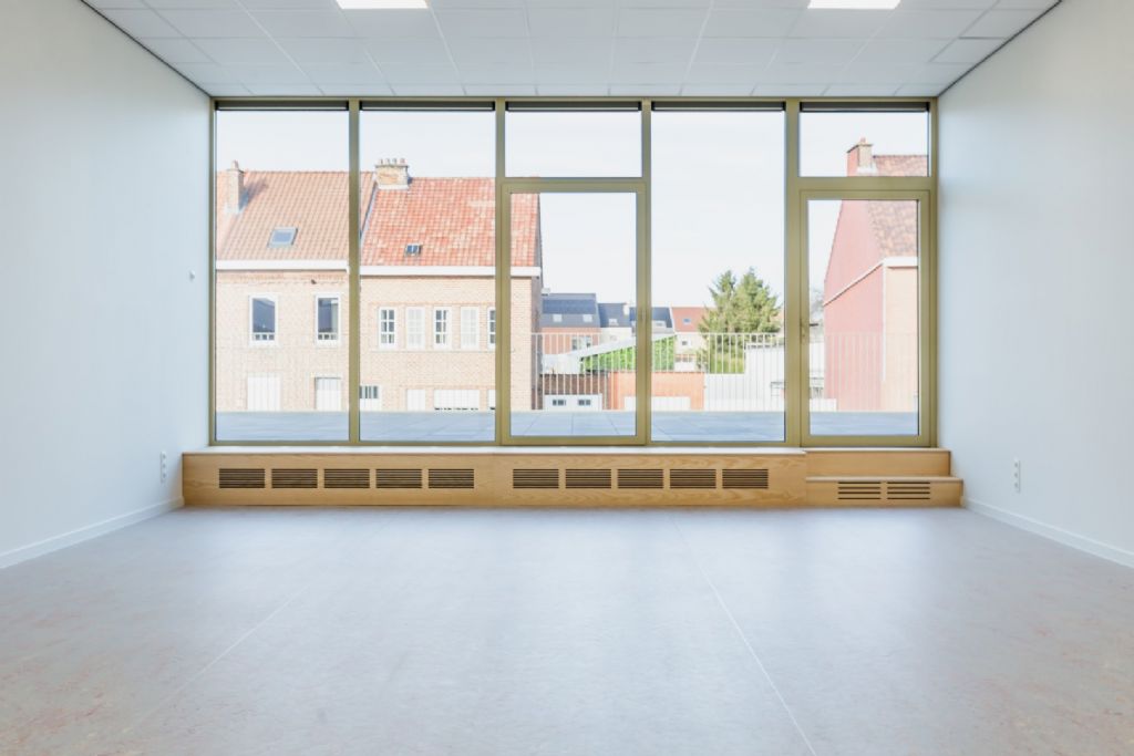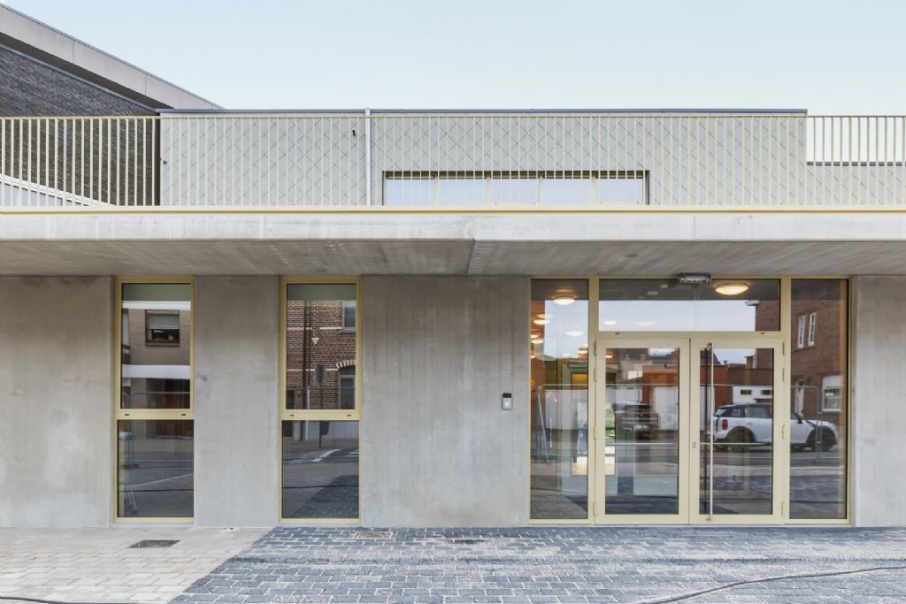 Omdat de gangen slechts lokalen aan één zijde bedienden, besloot OSK-AR het nieuwe volume in te planten tussen de bestaande volumes om zo de gangen langs twee zijden te voorzien van ruimtes. Het voorplein werd zo volledig ingevuld, met één compact geheel tot gevolg.