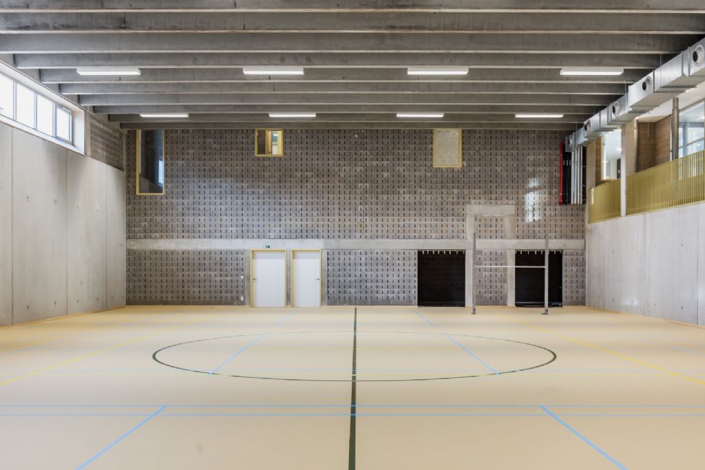 Bijzonder in het ontwerp van OSK-AR is ongetwijfeld de sportzaal, die het kloppend hart van de school wordt. Omdat die de nodige hoogte nodig had maar de architecten streefden naar een compact volume, werd ze in de grond geduwd, zodat het dak van de zaal op dezelfde hoogte komt als de verdiepingsvloer van het bestaande gebouw. Langs één zijde van de sportzaal loopt daardoor de gang, die ook kan dienen als sporttribune. Bij evenementen kunnen de glazen wanden langs de andere zijde van de gang en eventueel ook de achtergevel worden opengezet, zodat de zaal refter en speelplaats één geheel vormen. De sportzaal wordt na de schooluren en in de weekends ter beschikking gesteld van lokale verenigingen. Er werd door die openheid wel gebruik gemaakt van akoestische betonblokken op de kopse wanden, die overigens een speels effect creëren. Het dak van de sportzaal is toegankelijk.