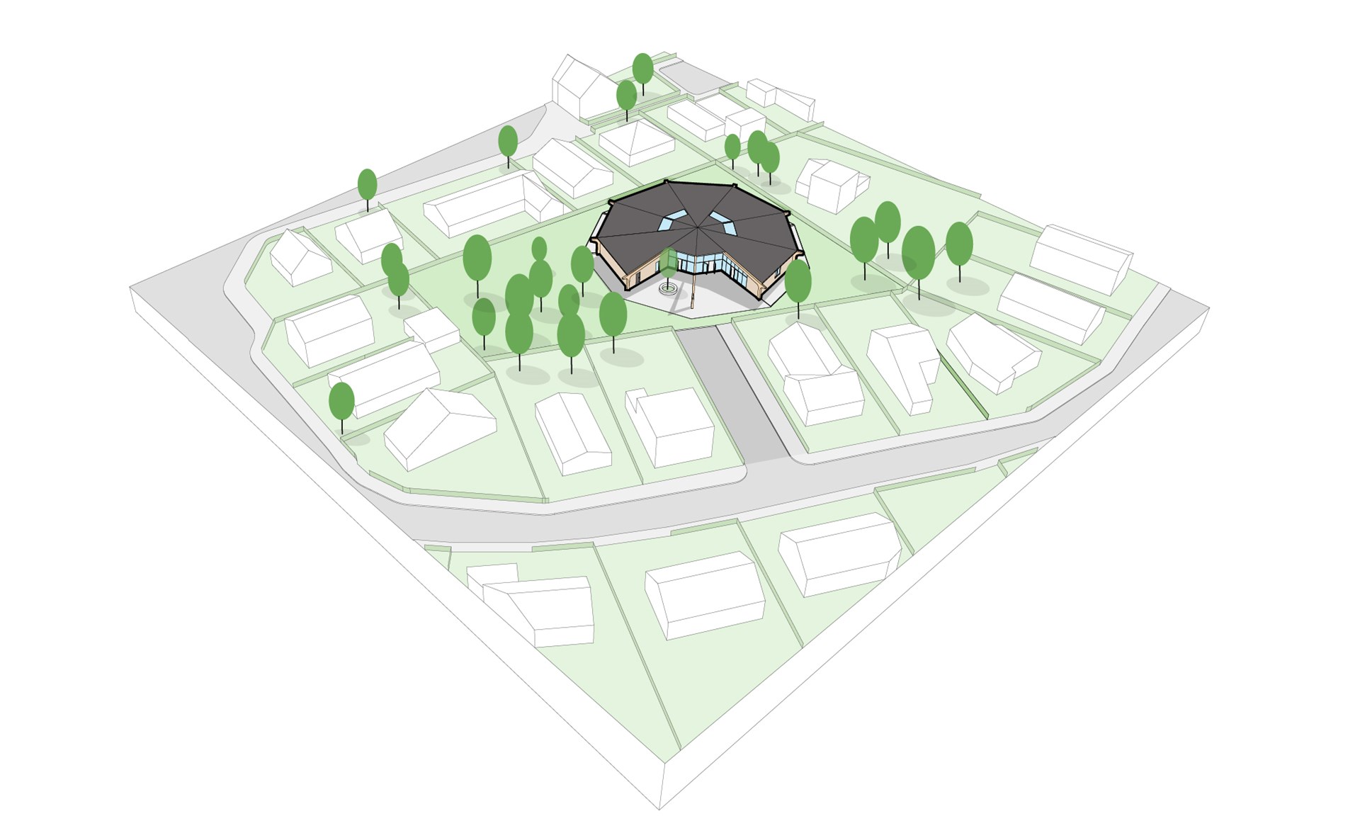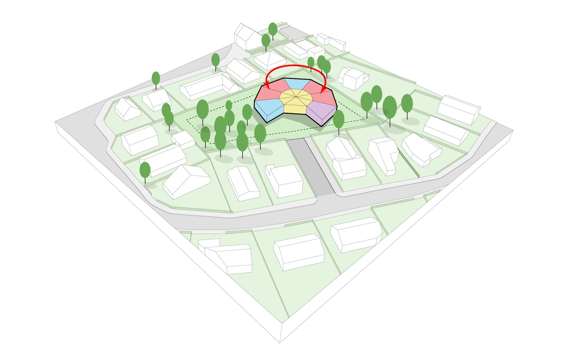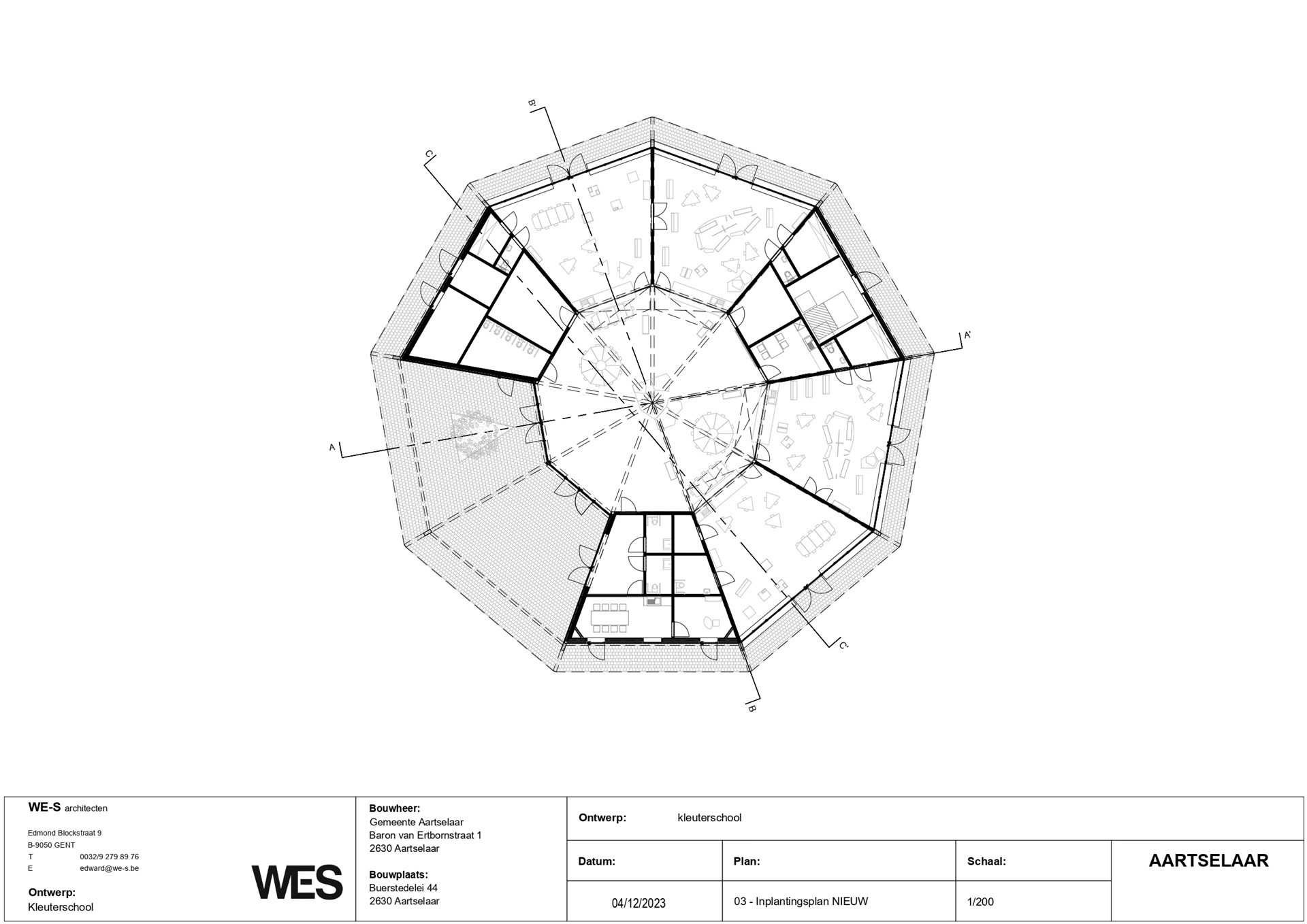 Volgende stap was om de klassen als een ring rond de polyvalente zaal te schakelen. Zo ontstaat een bijzonder compact gebouw waarbij alle klassen een rechtstreekse link met de polyvalente zaal hebben. De refter maakt integraal deel uit van deze centrale zaal. Het gebouw wordt aan de oostzijde van het terrein geplaatst en wordt vormgegeven als een regelmatige negenhoek die zich aan de hand van een overdekte speelruimte opent naar de ingang. Het resultaat is een compact en efficiƫnt gebouw dat zich ondanks zijn speelse vorm moeiteloos schikt binnen de beperkte perceelsgrenzen.