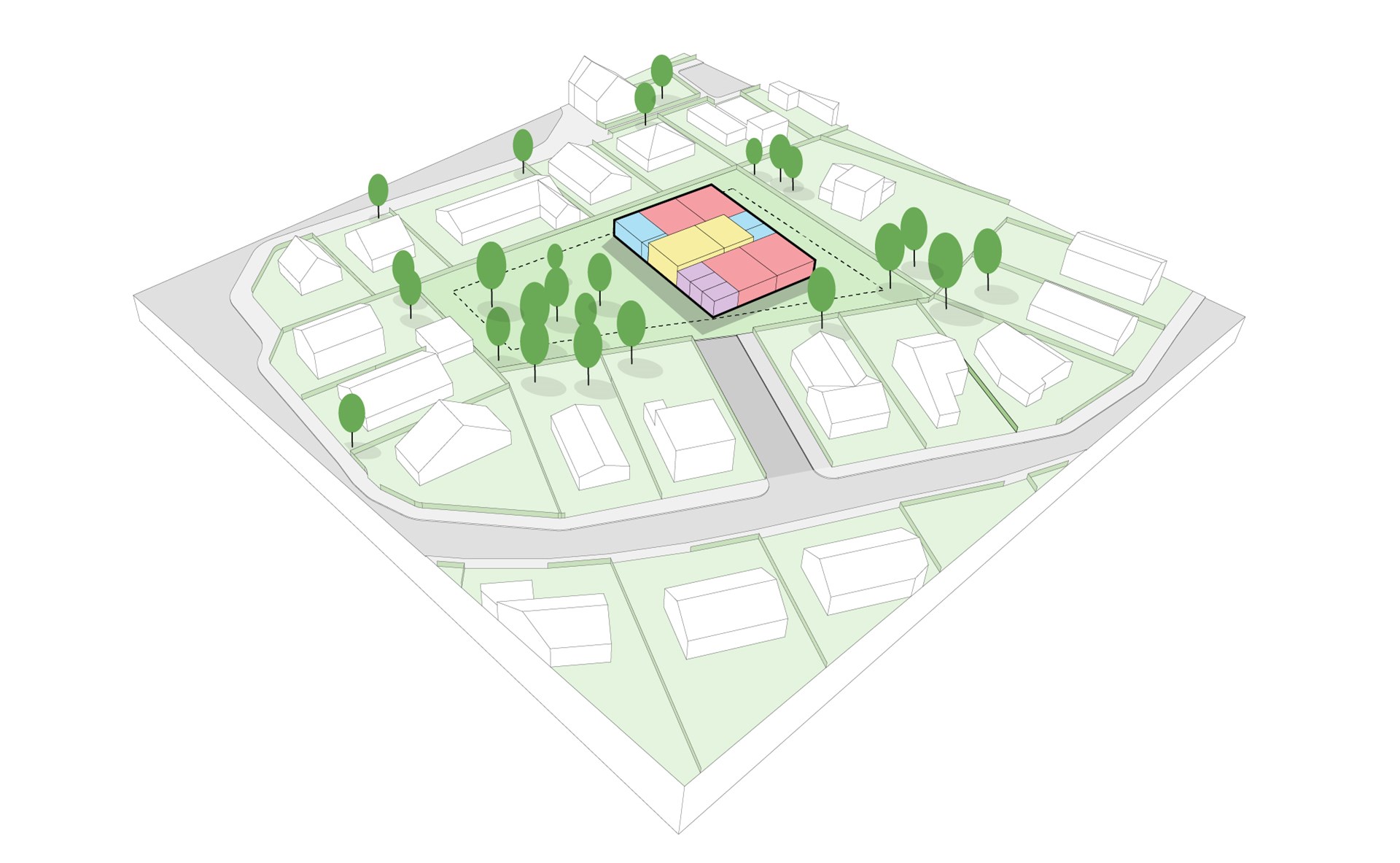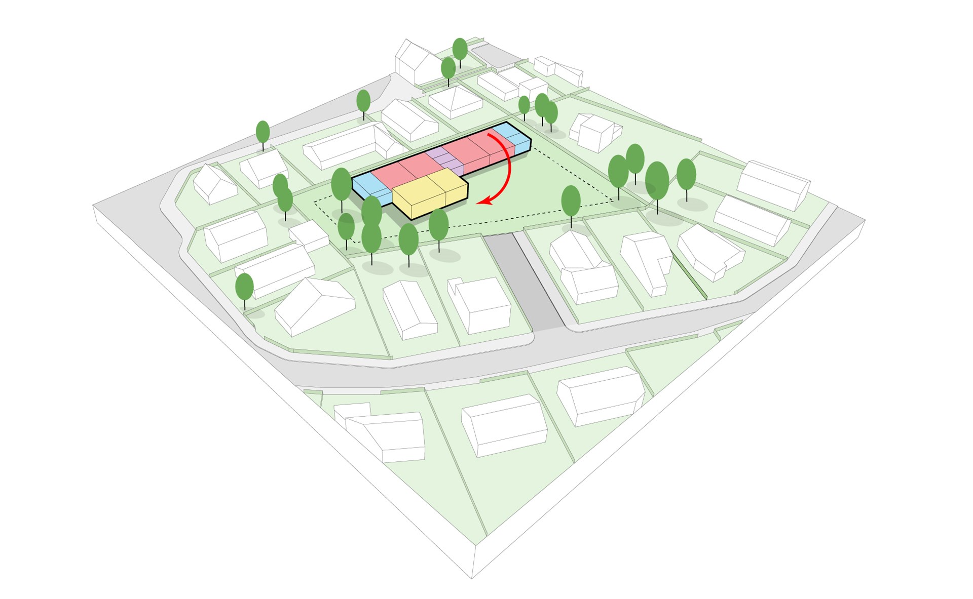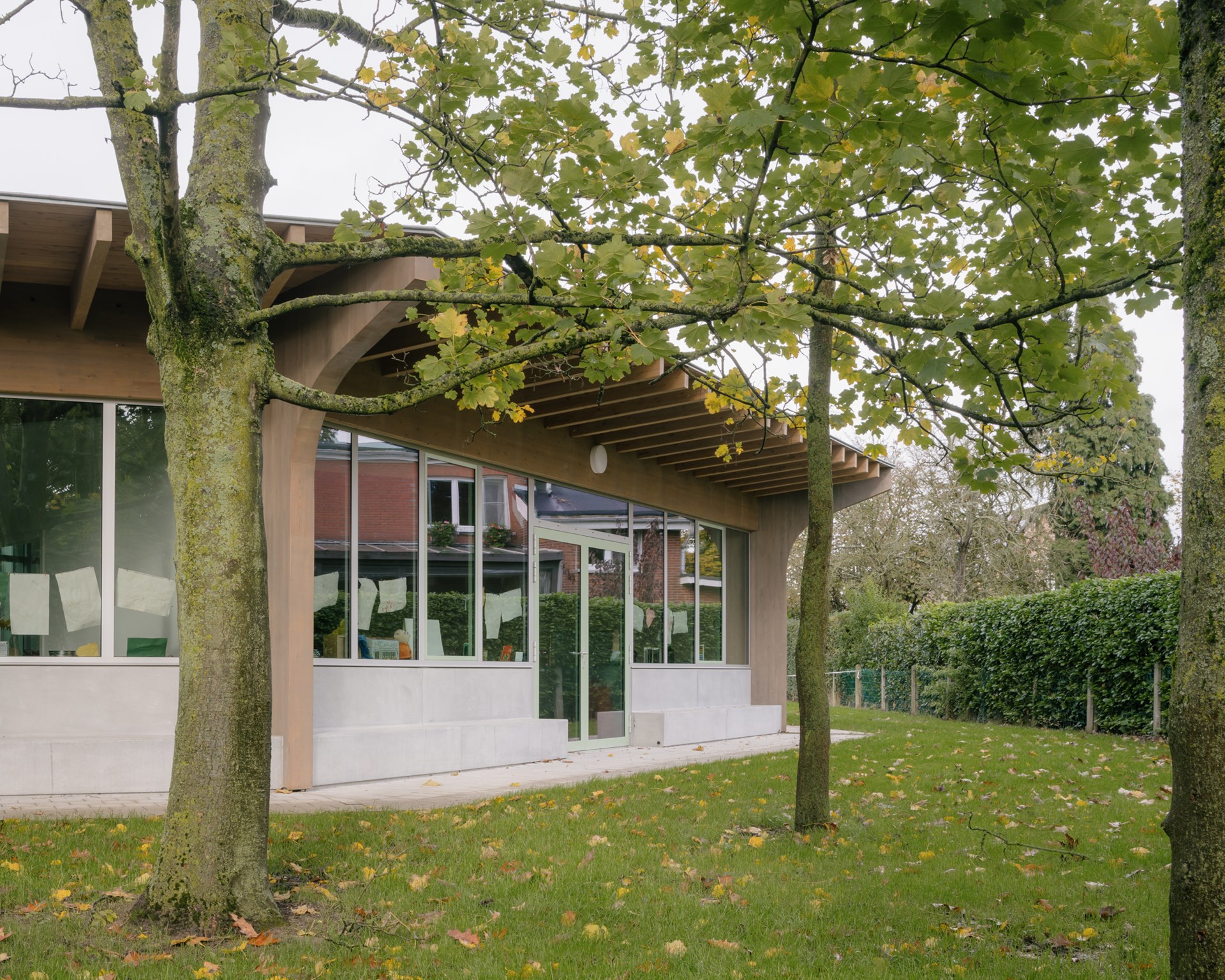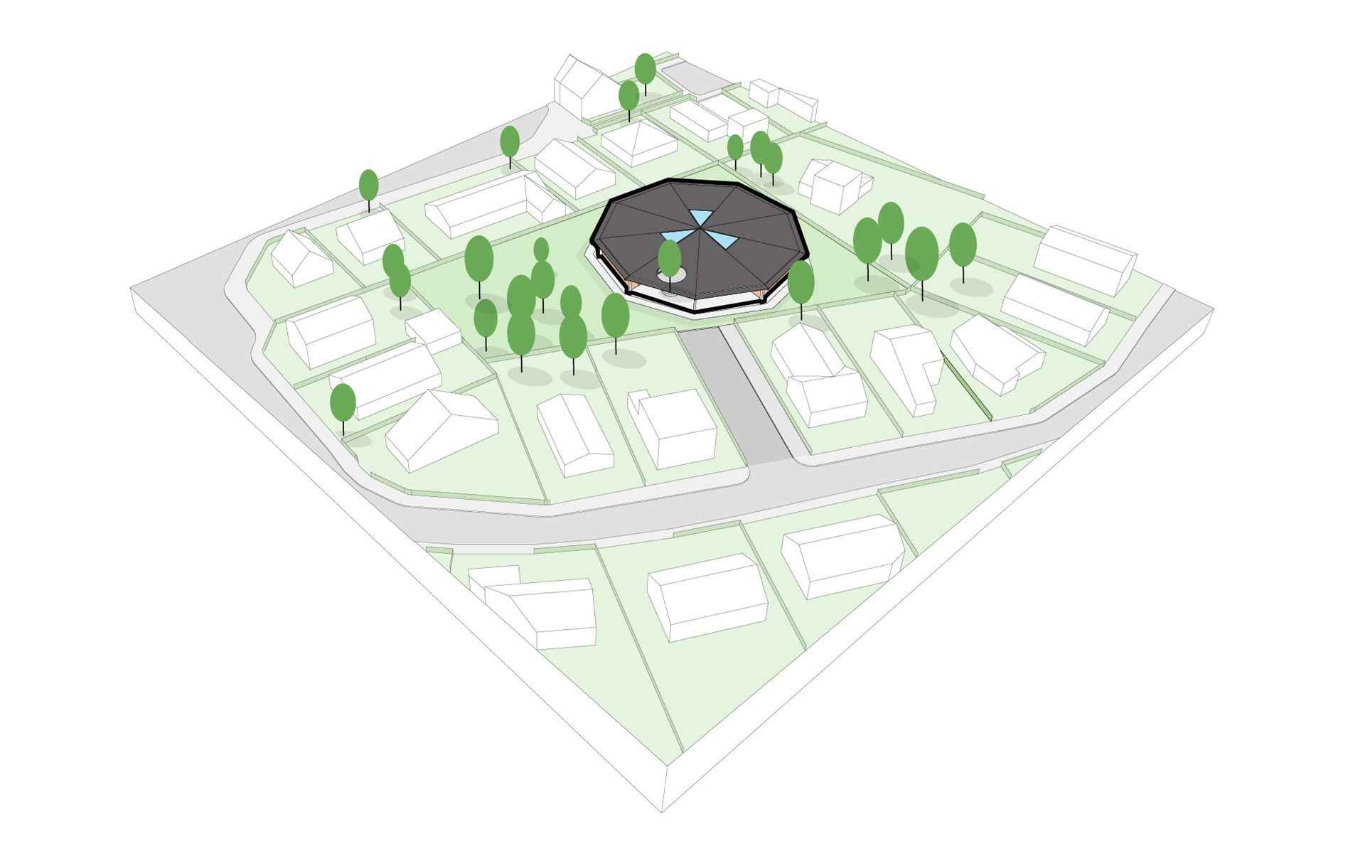 Volgende stap was om de klassen als een ring rond de polyvalente zaal te schakelen. Zo ontstaat een bijzonder compact gebouw waarbij alle klassen een rechtstreekse link met de polyvalente zaal hebben. De refter maakt integraal deel uit van deze centrale zaal. Het gebouw wordt aan de oostzijde van het terrein geplaatst en wordt vormgegeven als een regelmatige negenhoek die zich aan de hand van een overdekte speelruimte opent naar de ingang. Het resultaat is een compact en efficiƫnt gebouw dat zich ondanks zijn speelse vorm moeiteloos schikt binnen de beperkte perceelsgrenzen.