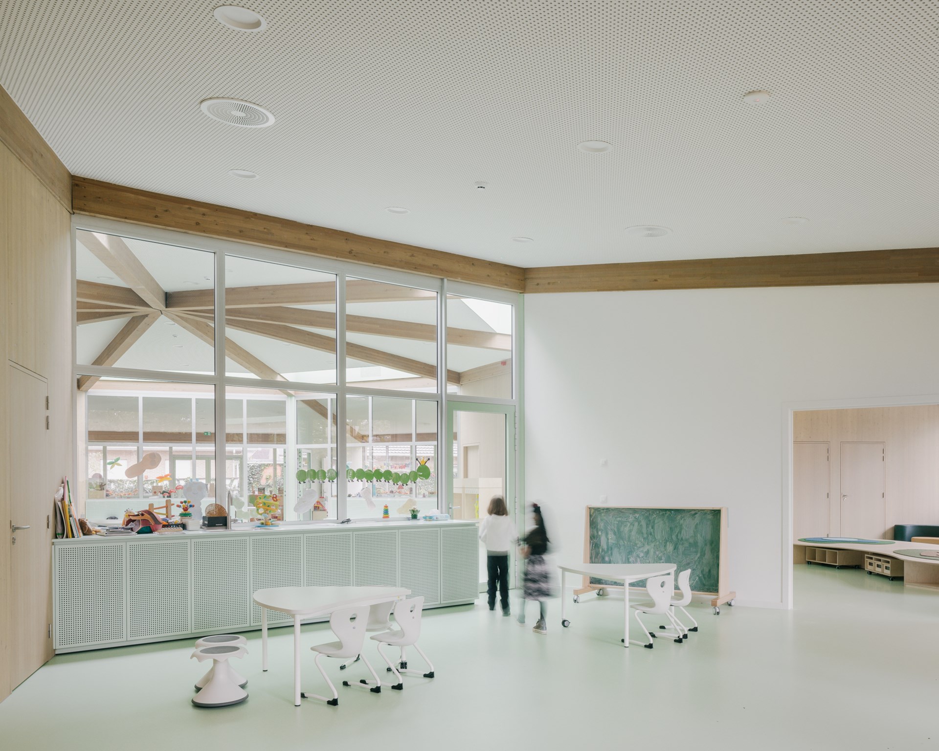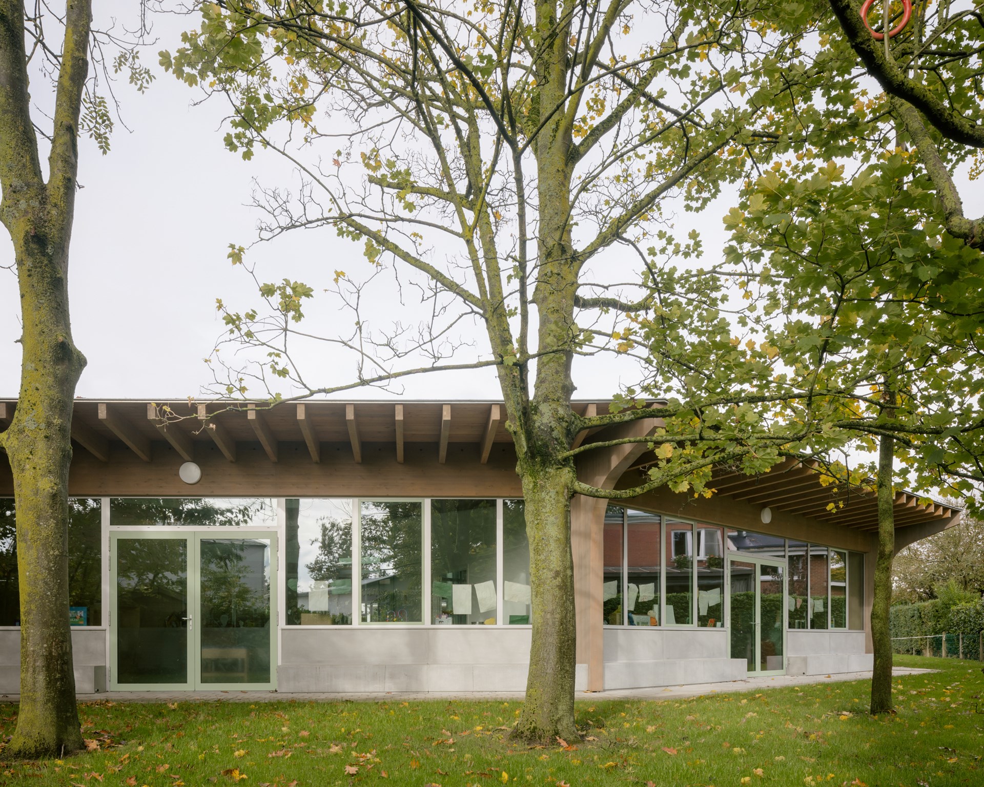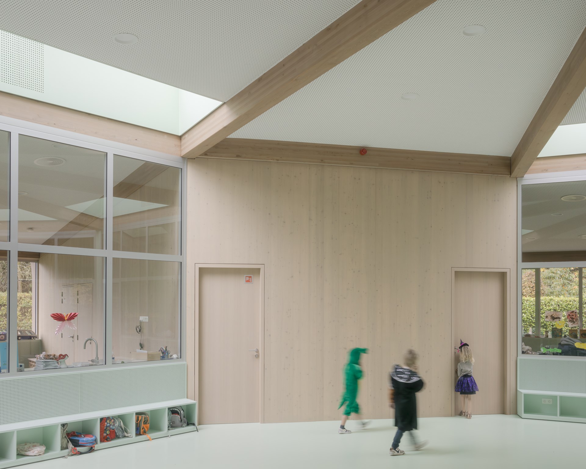 Het programma van eisen vroeg vier identieke kleuterklassen. Er diende tevens een polyvalente zaal te worden voorzien, alsook een refter, enkele bergingen, een keuken, een personeelsruimte en een zorglokaal. WE-S architecten stelde voor om de kleuterklassen rug aan rug te schakelen, waardoor ze per twee kunnen worden gedeeld. Iedere klas beschikt over een eigen berging met sanitair. Zodoende ontstond in het ontwerpproces een langgerekte balk die tegen de polyvalente zaal aanleunt.