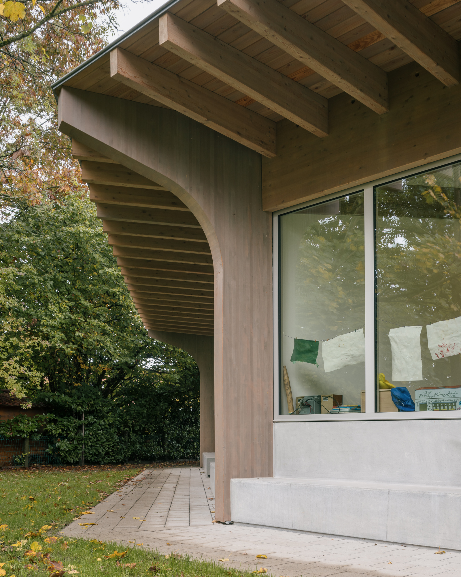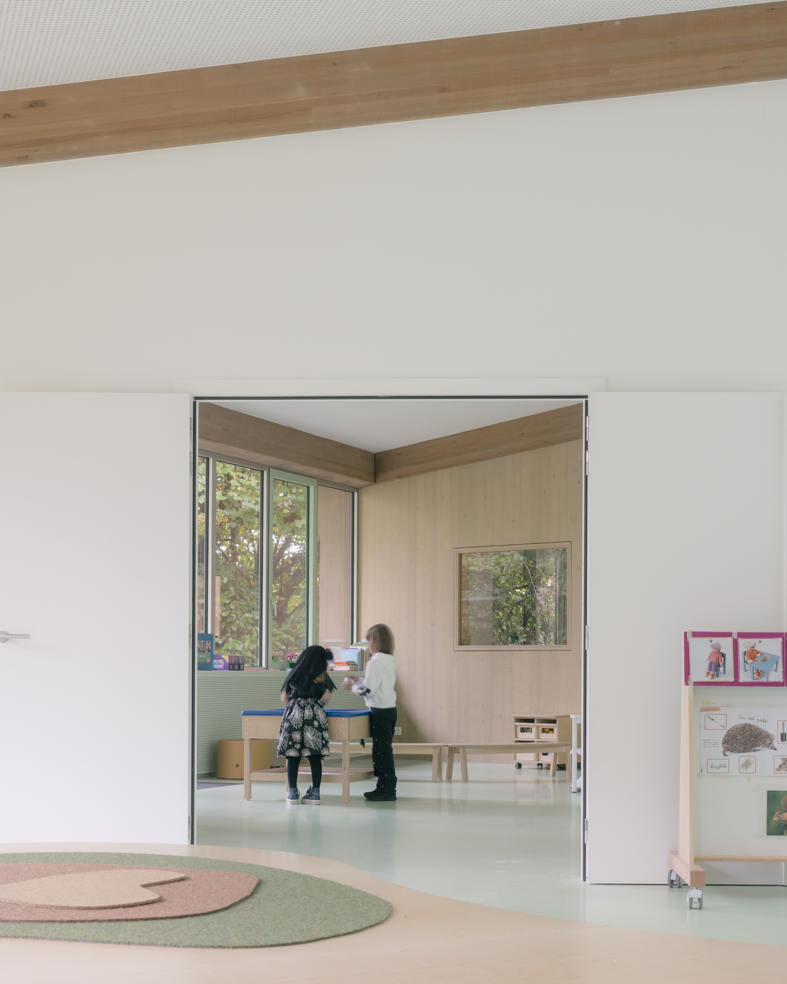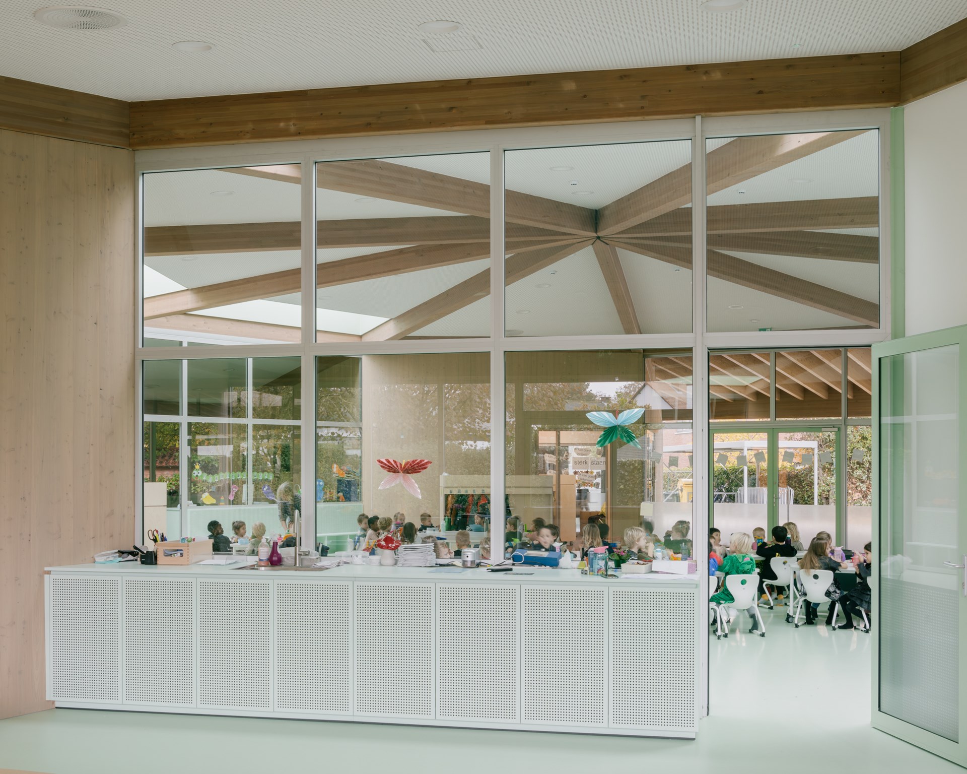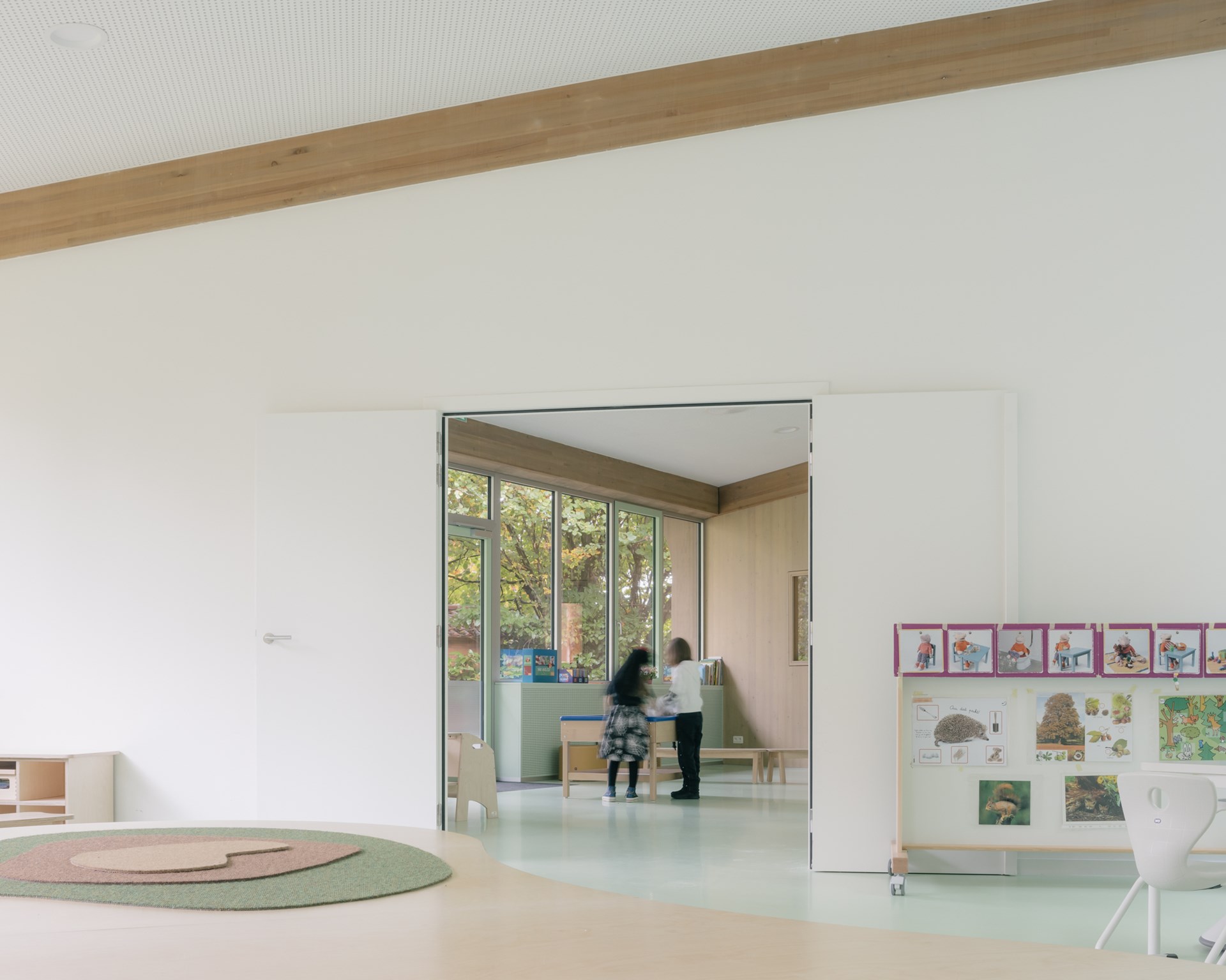 Het programma van eisen vroeg vier identieke kleuterklassen. Er diende tevens een polyvalente zaal te worden voorzien, alsook een refter, enkele bergingen, een keuken, een personeelsruimte en een zorglokaal. WE-S architecten stelde voor om de kleuterklassen rug aan rug te schakelen, waardoor ze per twee kunnen worden gedeeld. Iedere klas beschikt over een eigen berging met sanitair. Zodoende ontstond in het ontwerpproces een langgerekte balk die tegen de polyvalente zaal aanleunt.