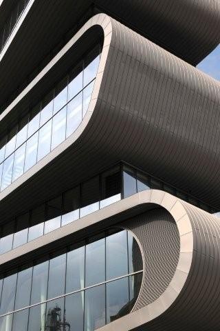 De gevel en het dak van het nieuwe kantoorgebouw werden volledig bekleed met vloeiende zinkbanen in Quartz-Zinc®. Zink is een eigen materiaal van Umicore. De staande naad van de zinken bekleding benadrukt de vorm en beweging van het gebouw nog meer. Om het contrast met de nieuwbouw verder aan te scherpen, kregen de overige gebouwen in de omgeving een beduidend strakkere gevelbekleding met horizontale banen in een contrasterende kleur, met name Anthra-zinc.