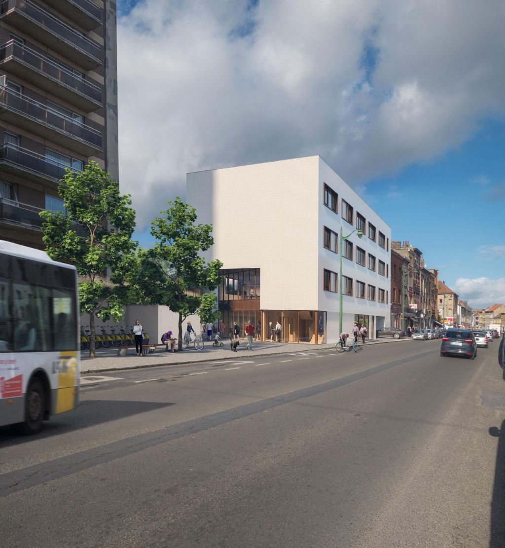 Langs de Bergensesteenweg wordt een kantoorgebouw van vier bouwlagen opgetrokken, met op de gelijkvloerse verdieping een sociaal restaurant. Dankzij de grote raampartijen en het terras aan de achterzijde, rechtstreeks grenzend aan een groene ontmoetingsruimte, kan deze plek een trekpleister worden in de straat. Op de drie bovenliggende verdiepingen bevinden zich de nieuwe kantoren van de Anderlechtse Haard die, vanwege hun flexibiliteit, naar de noden van 50 à 60 medewerkers ingericht kunnen worden.