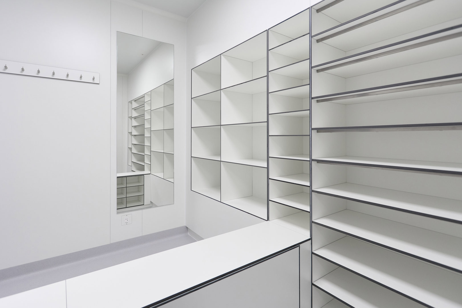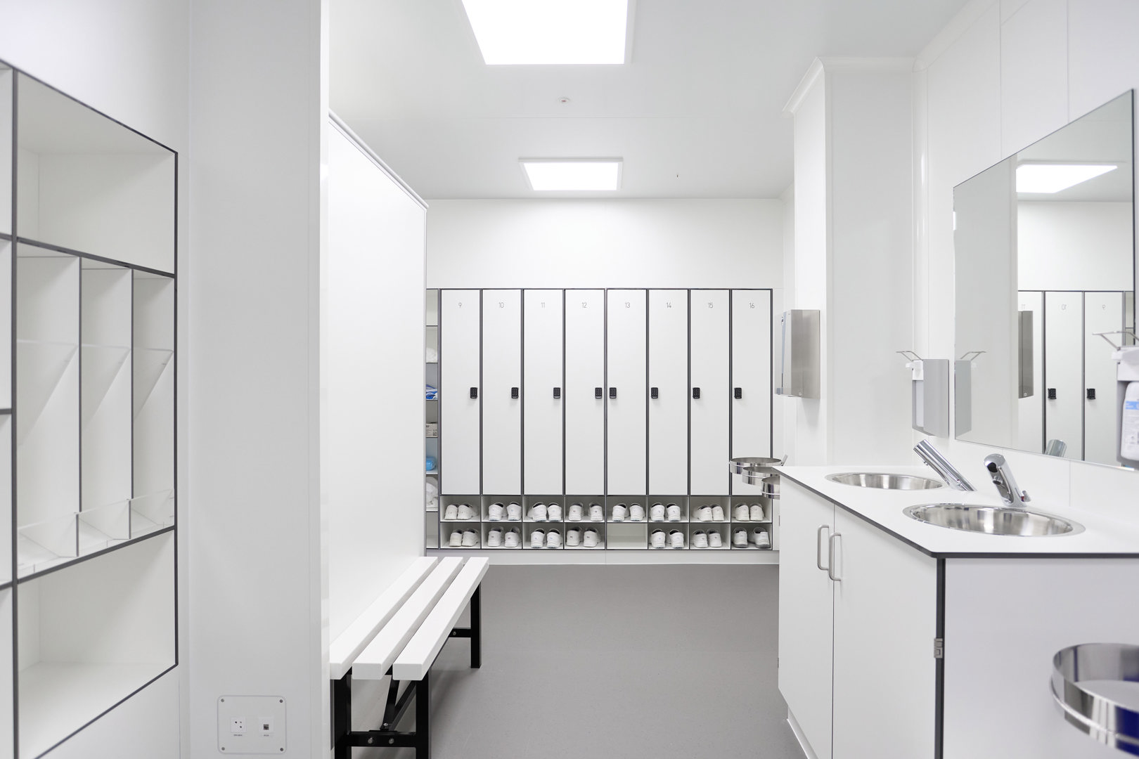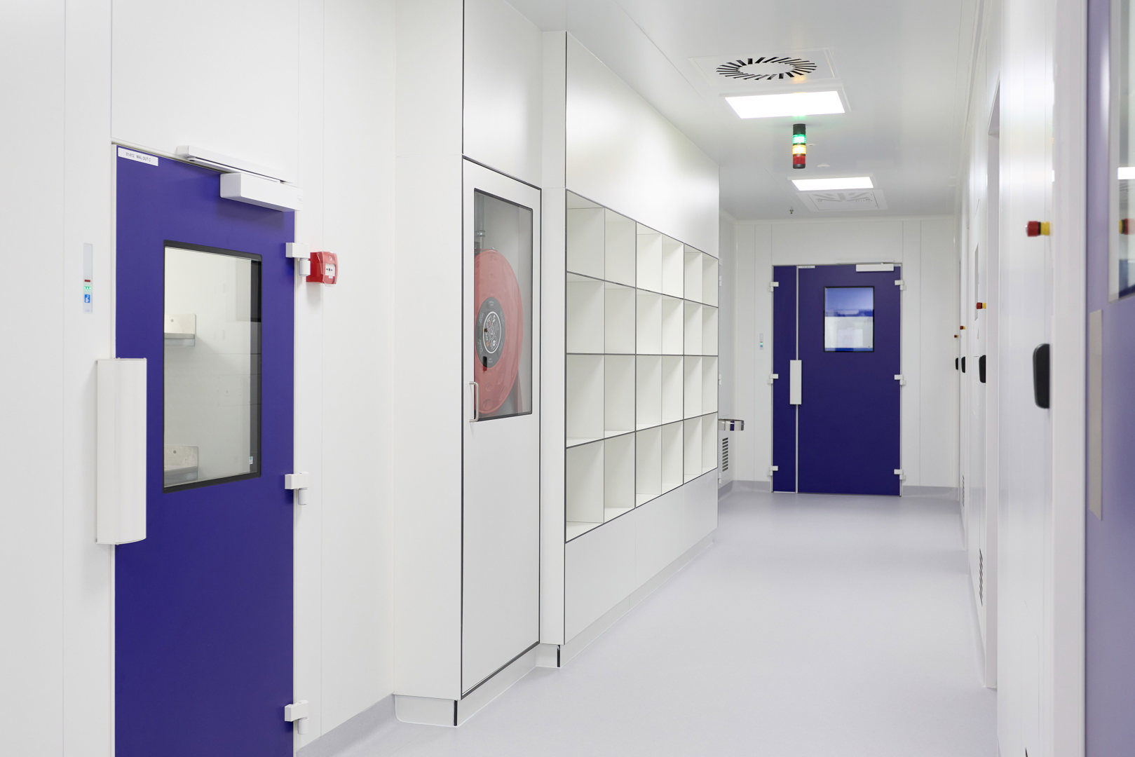 In dit geval ging het onder andere om een cleanroom Klasse B. Voor de sanitaire wanden en andere vaste inrichtingselementen werkt Kardeco samen met Kupan, dat hier op zijn beurt de Max Compact Interior platen van Fundermax verwerkte.
