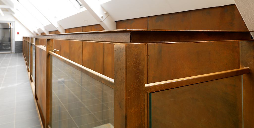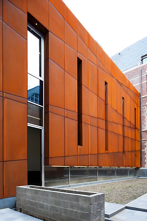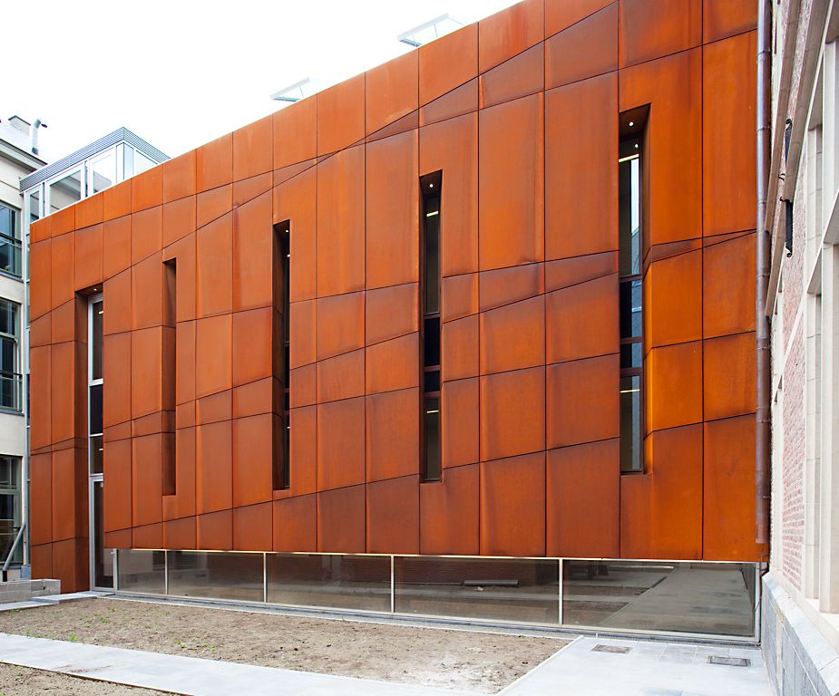 Vlakke cortenstaalplaten sieren de buitengevel van de Emile Braunschool in Gent. Door een specifieke verzaging ontstond een bijzonder lijnenspel in de façade. In het interieur fungeert een borstwering uit cortenstaal met glaspanelen als pronkstuk.