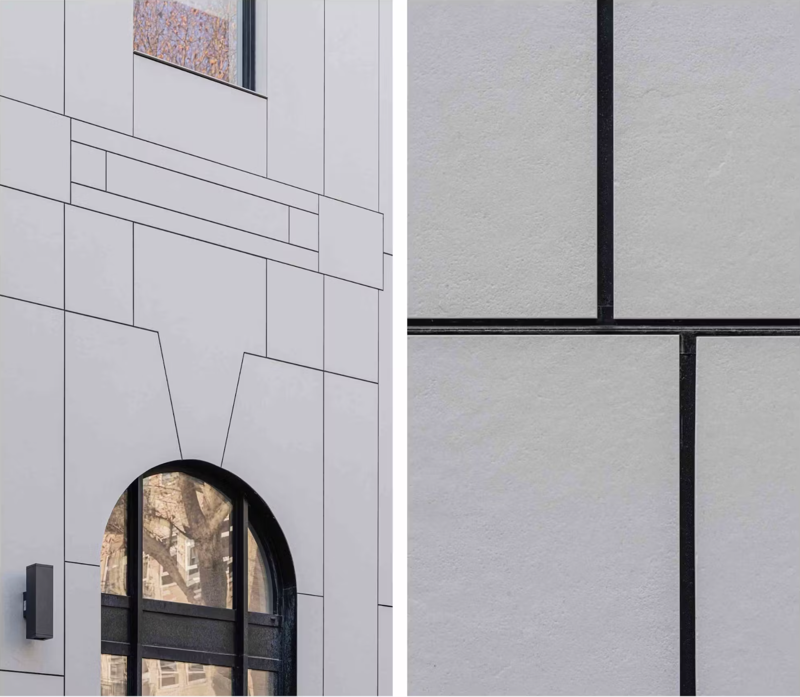 Er was een verbluffend staaltje meet- en snijwerk dat plaatsvond in de Cosentino-fabriek in Spanje. Daar werden alle gevelbekledingsplaten op maat verwerkt tot de perfecte ‘blokkendoos’ om de classicistische gevel te laten echoën doorheen het pand. Op de voorgevel werd gekozen voor Dekton® Fossil, een donkergrijze variant met een willekeurig patroon van bleke vegen en vlekken. Voor de achterbouw en de muren rondom de centrale patio, werd dan weer een lichte beige variant gebruikt, nl. Dekton® Edora.