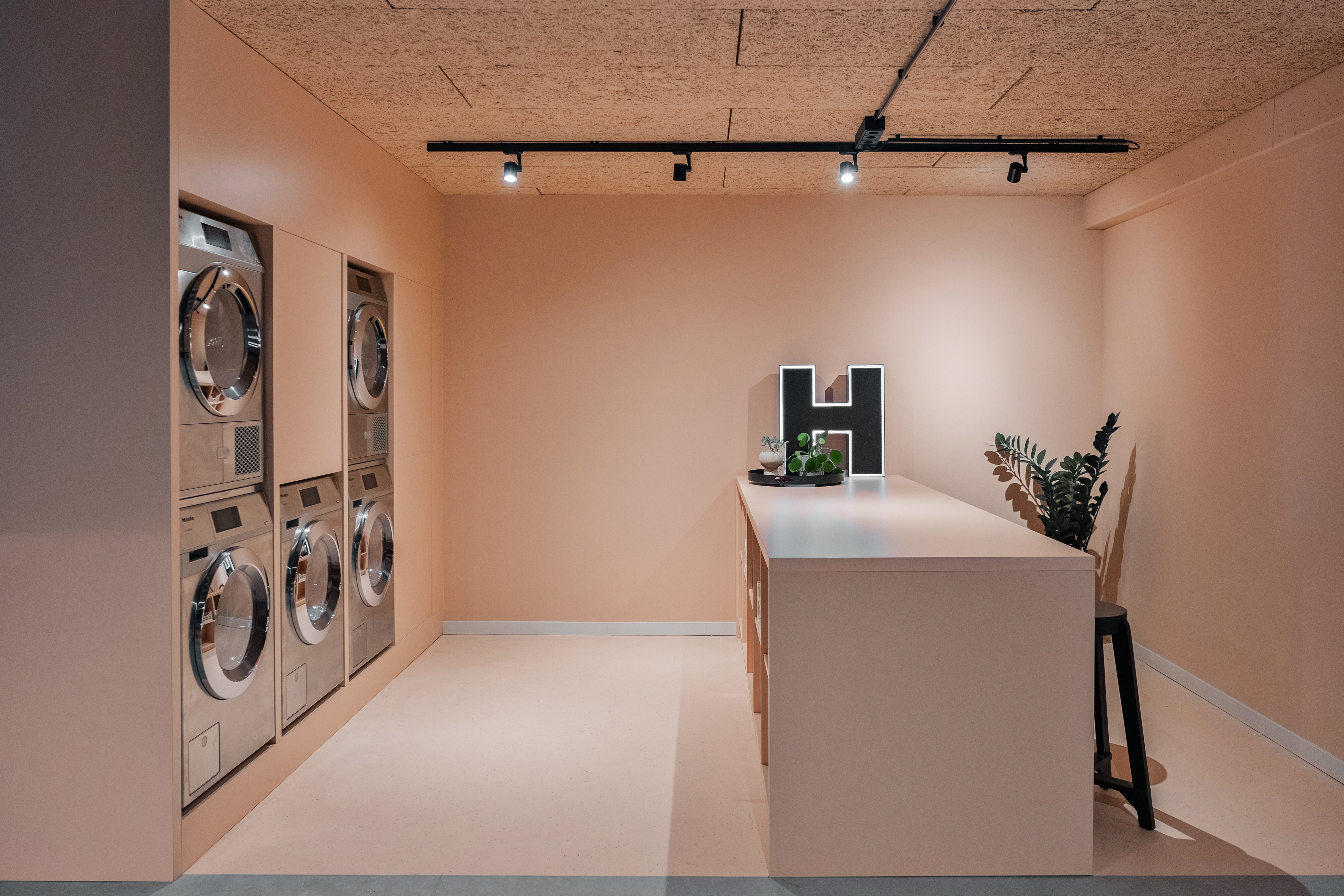 Omdat de kamers uitgaan van less is more, speelde het Hasseltse bureau erg in op de publieke ruimtes: less but more! Creneau International: “Studenten hokken graag samen (het ontwerp is pre-covid), de publieke ruimtes zijn dus een verlengde van hun sobere privéleefruimte. Zo kunnen ze even ontsnappen uit hun kot en ontspannen in het snoezelbad, studeren in één van de studyhauses of een babbeltje doen in our haus, ‘de lobby’.”