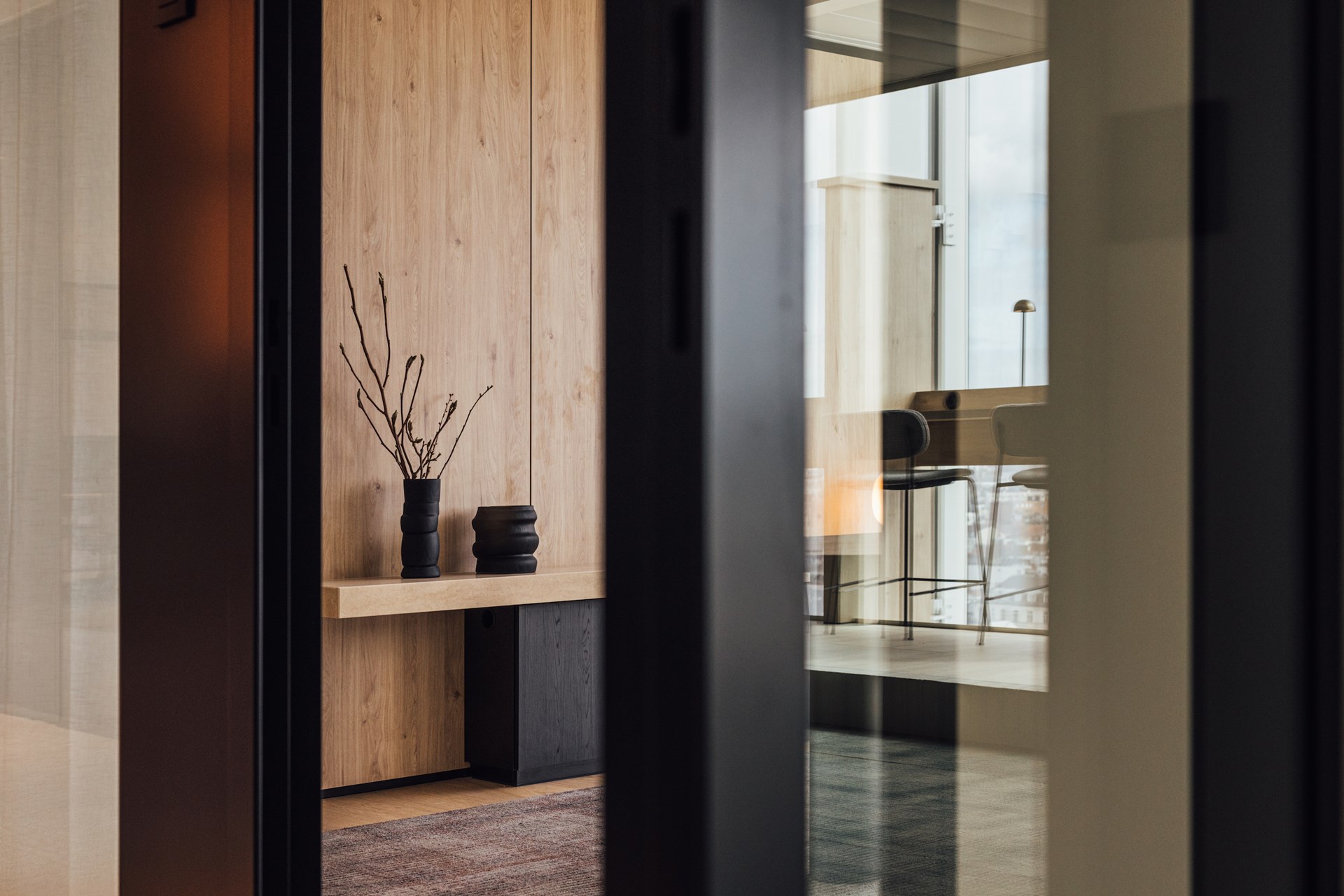 Op de 17e en bovenste verdieping vinden we een tweede front desk waar gasten rechtsreeks onthaald kunnen worden in een skylounge met exclusieve receptieruimte en volledig uitgerust met aparte cateringkeuken voor events. Via een dubbele deur krijgen we dan toegang tot de bestuurskamer, een indrukwekkende ‘oval office’ voor het internationale bedrijf met een panoramische zicht over de stad, maar eveneens gordijnen allround die privacy garanderen. De grote ovale tafel biedt plaats aan 18 bestuursleden, met een ingebouwd scherm voor elke zitplek en opnieuw 2 levensgrote schermen die wereldwijd vergaderen mogelijk maken.