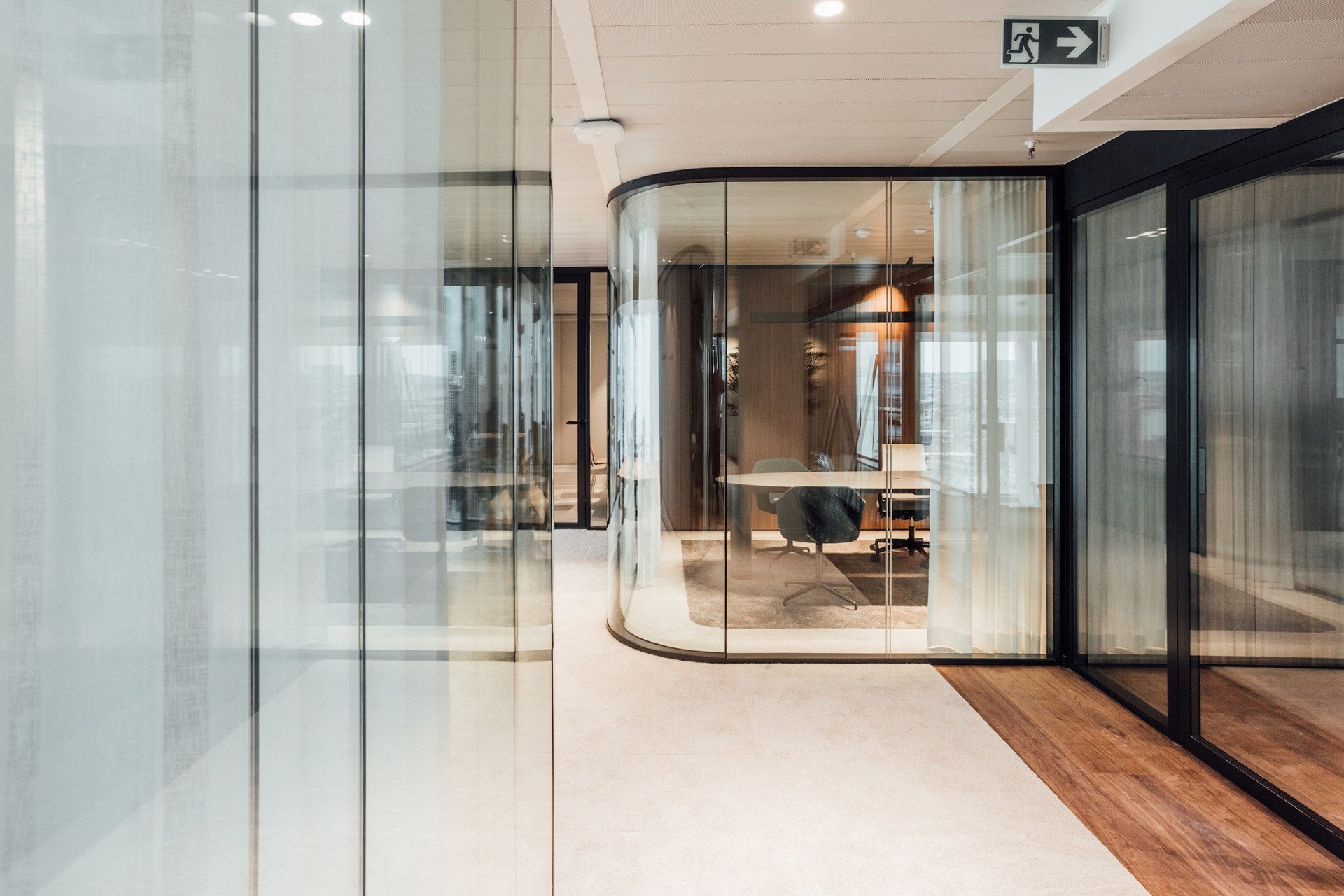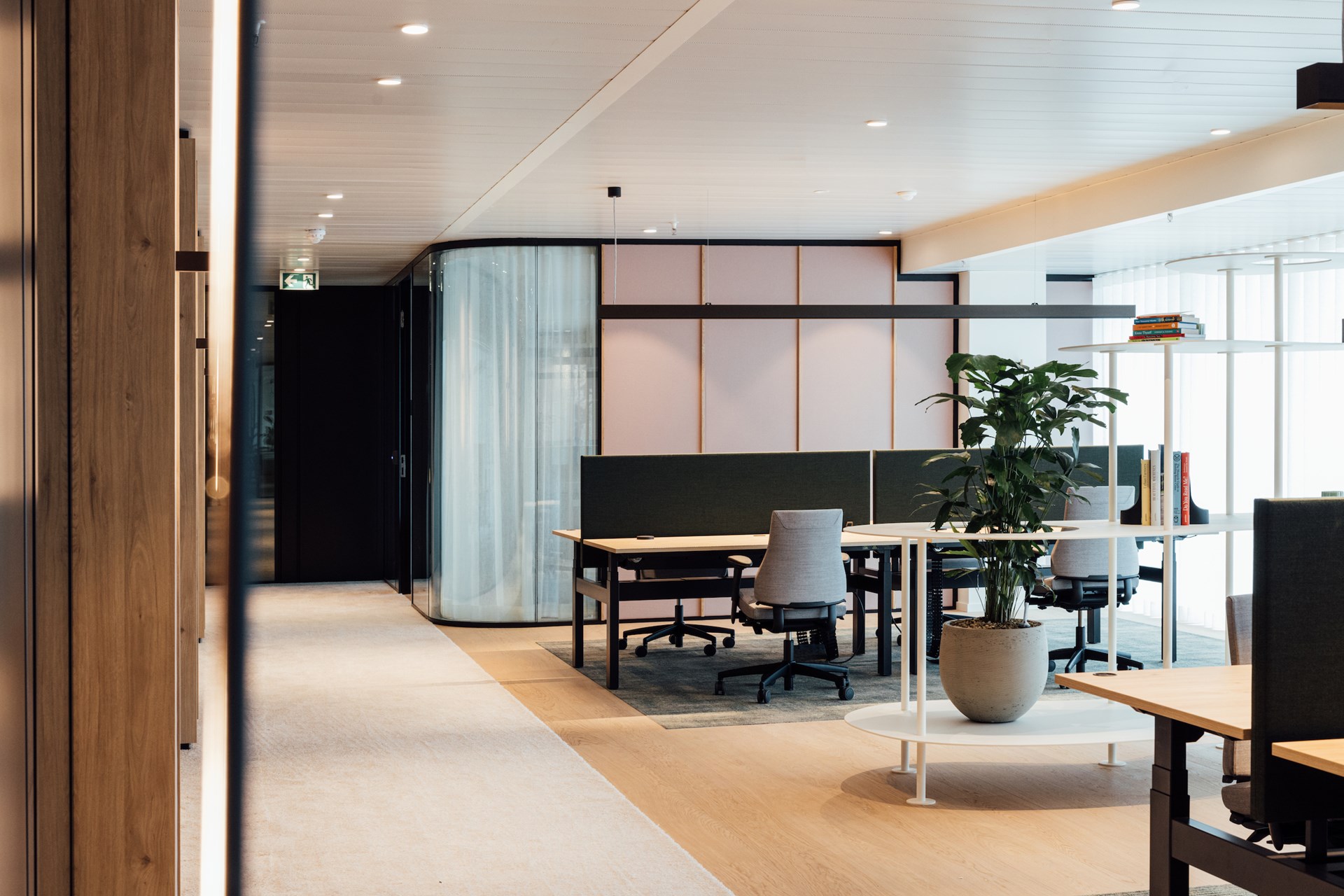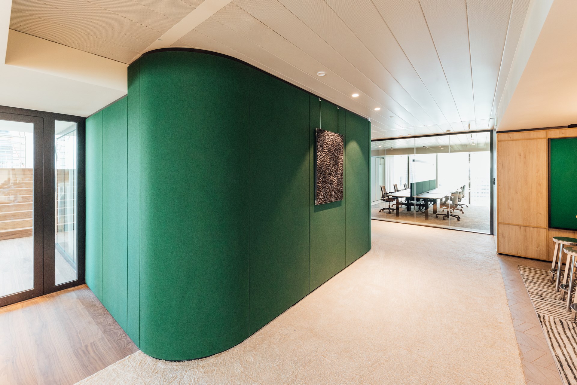 Daar waar connectie centraal staat bij het binnenkomen, wordt er bij het verder wandelen gefocust op werkcomfort met de integratie van akoestische elementen zoals ontdubbeld glas, gestoffeerde wandpanelen, hoogpolig tapijt en geperforeerde plafonds. Glooiende wanden in glas of notelaar, ronde vormen in op maat gemaakte kamerschermen en organische vergadertafels zorgen dat er van de originele rechthoekige kantooromgeving niets meer zichtbaar is.