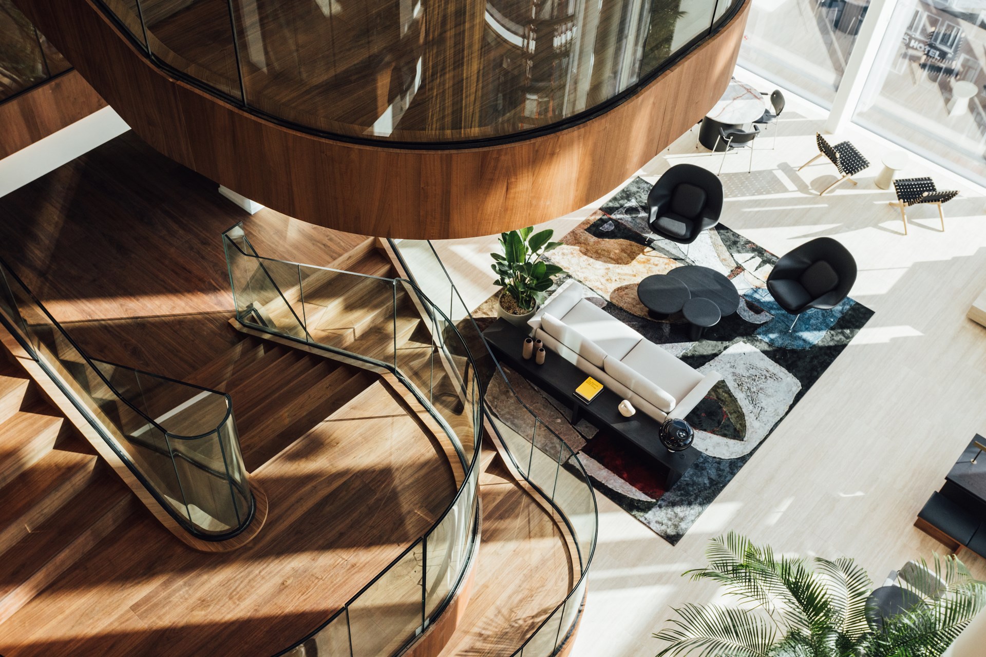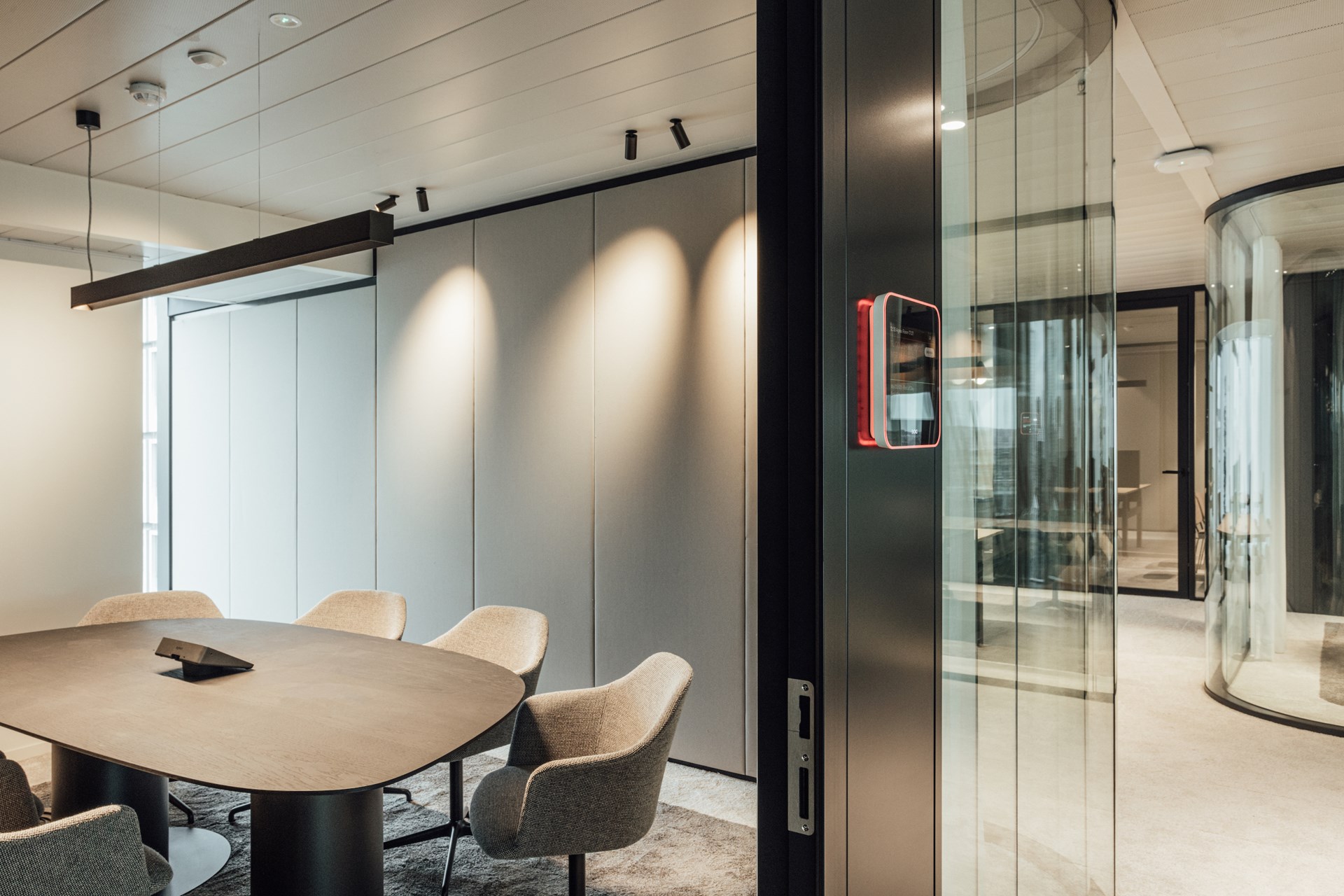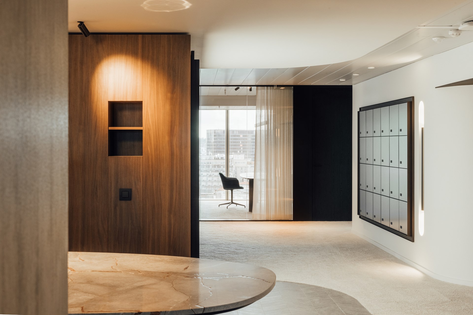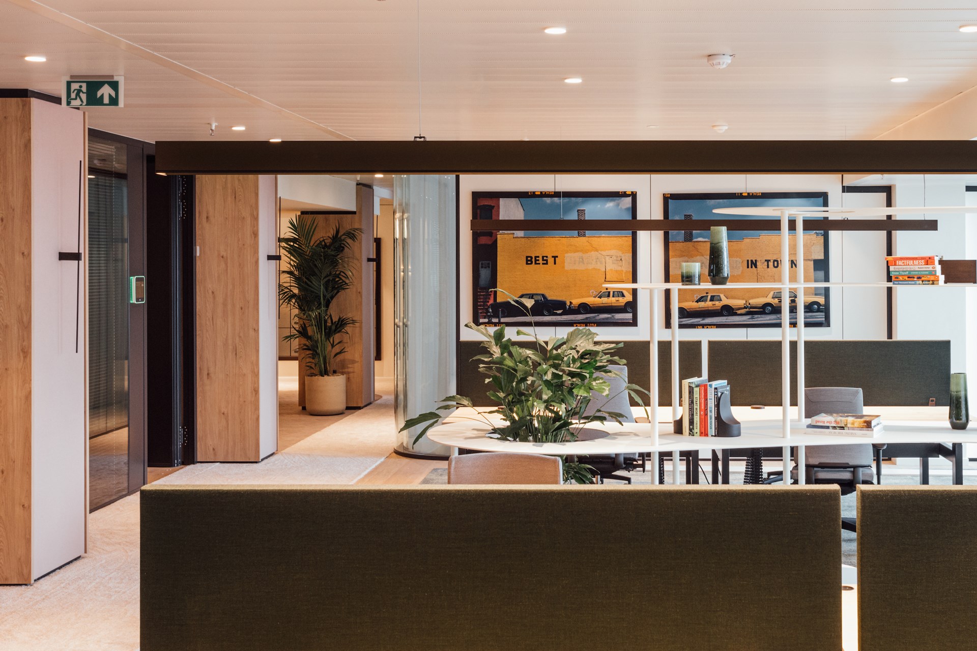 Daar waar connectie centraal staat bij het binnenkomen, wordt er bij het verder wandelen gefocust op werkcomfort met de integratie van akoestische elementen zoals ontdubbeld glas, gestoffeerde wandpanelen, hoogpolig tapijt en geperforeerde plafonds. Glooiende wanden in glas of notelaar, ronde vormen in op maat gemaakte kamerschermen en organische vergadertafels zorgen dat er van de originele rechthoekige kantooromgeving niets meer zichtbaar is.