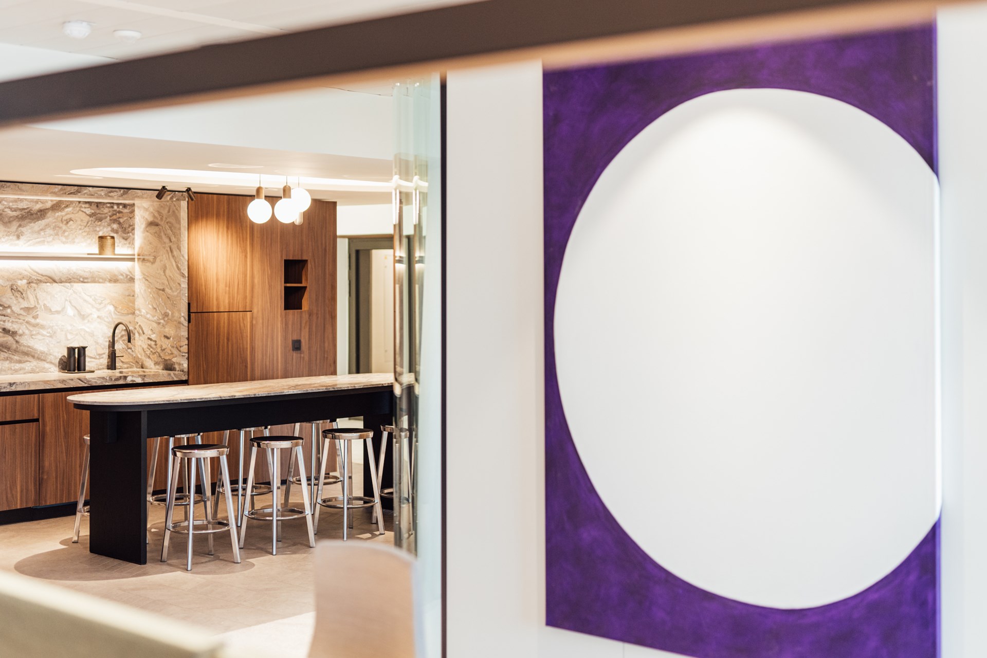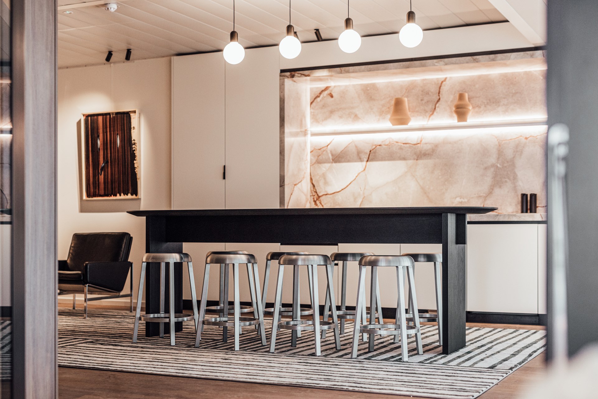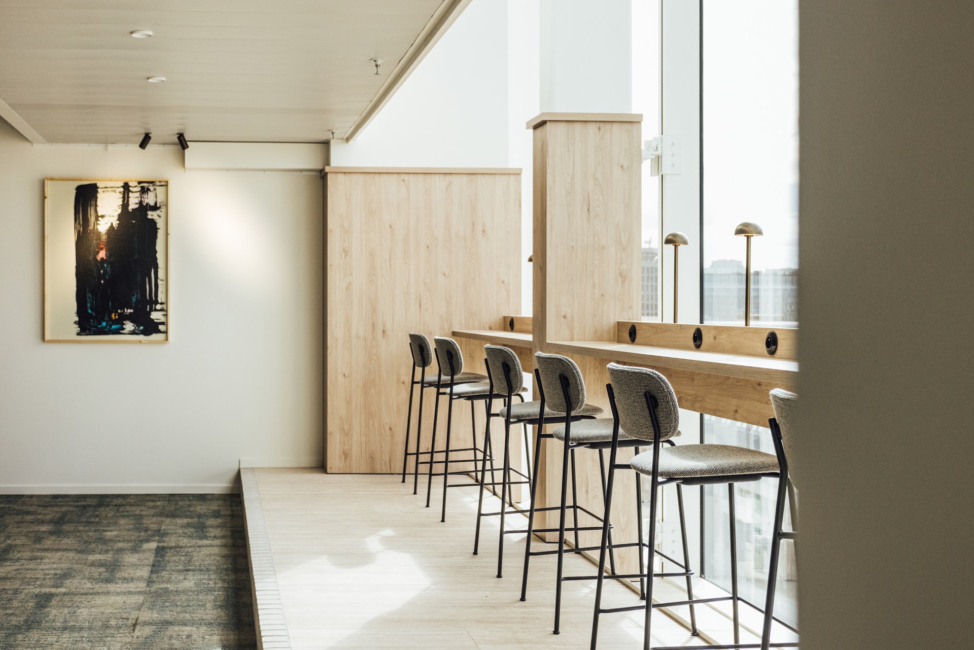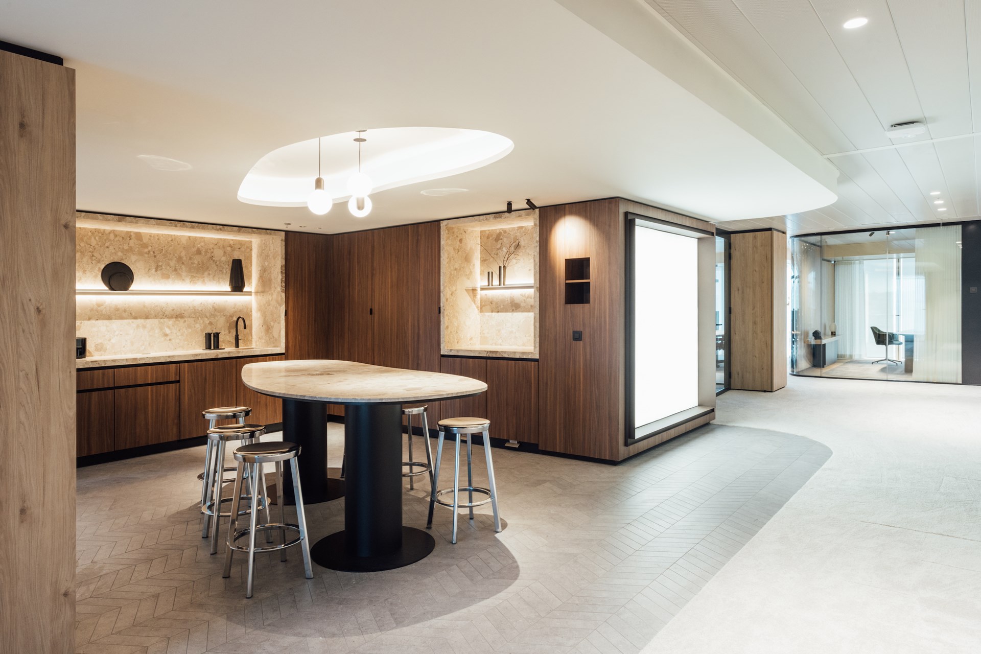 Zithoekjes variërend van lounge chairs en bistrotafels tot hogere barsettings faciliteren toevallige ontmoetingen en connectiemomenten, en nodigen uit om de persoonlijke voorkeur de vrije loop te laten bij het uitkiezen van een meeting- of werkplek. Hier geen refter of grijze keuken, maar een luxueuze bar in Patagonia kwartsiet, sfeervol verlicht met Tom Dixon’s Press Cone hanglampen, waar men zich kan bedienen van een hapje of een drankje. Enkel de zorgvuldig weggewerkte stopcontacten in tafels en wanden en de bibliotheek-stijl bronzen tafellampjes geven prijs dat het hier om een werkomgeving gaat.