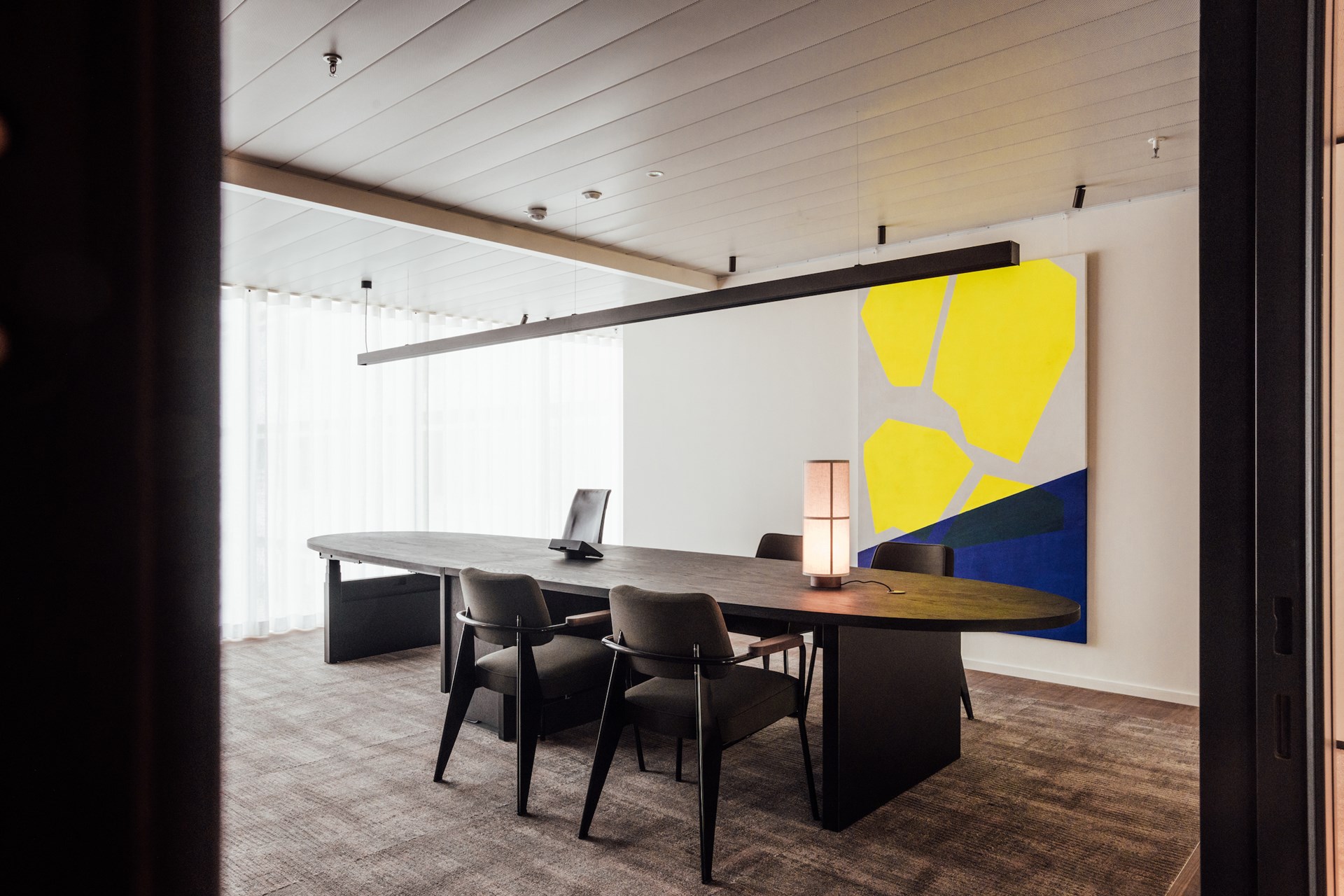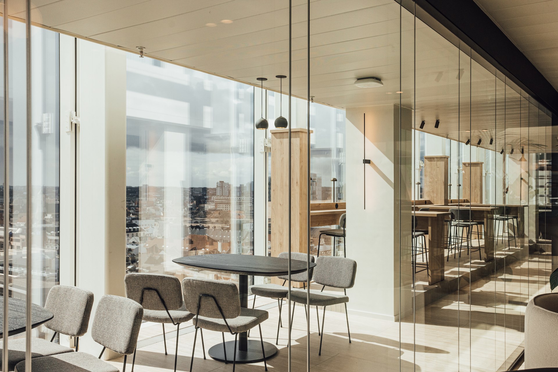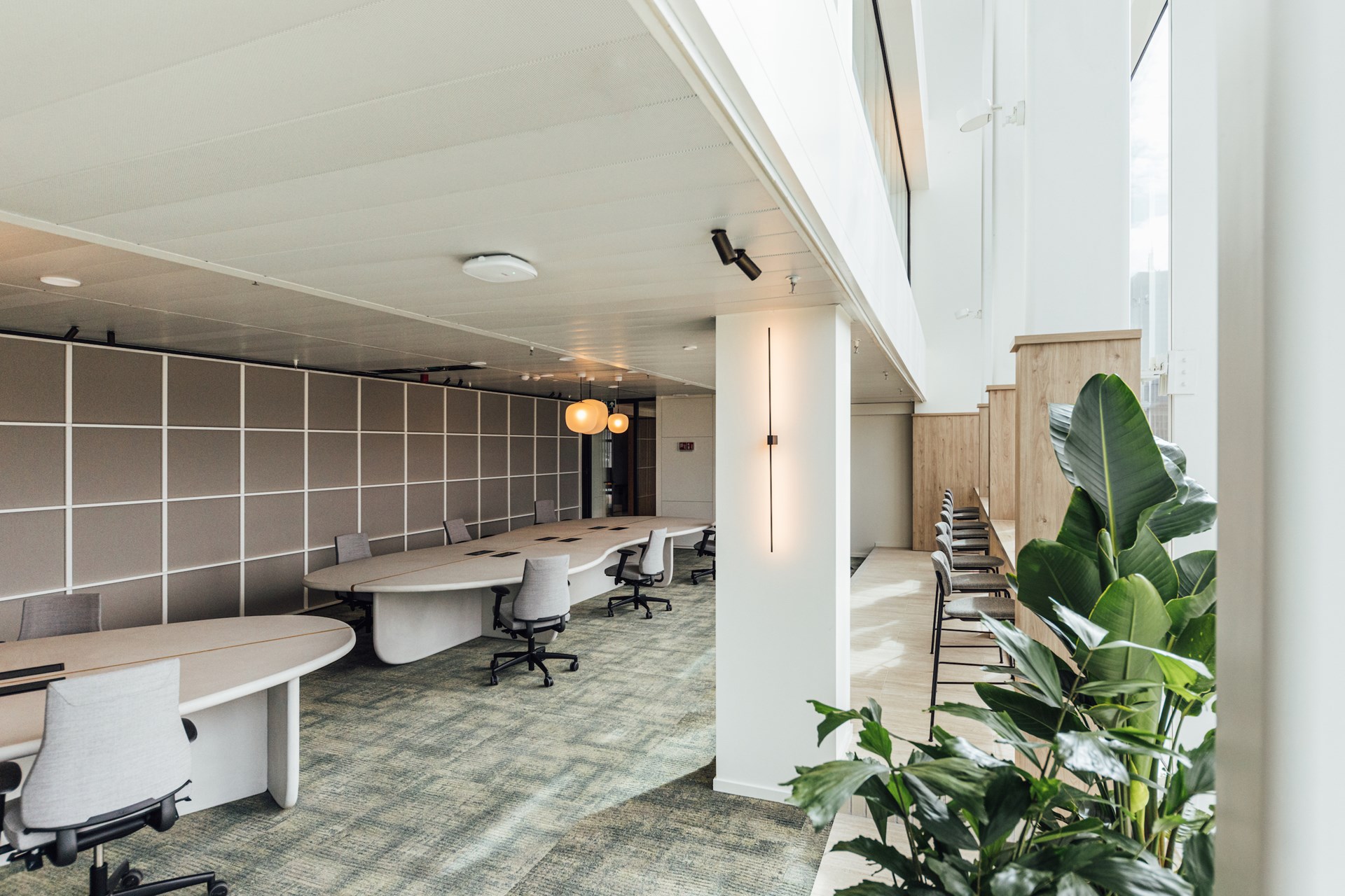 Terwijl de flex-werkplekken en kantoorruimtes zich in de schil van het gebouw bevinden om optimaal van het natuurlijke daglicht te profiteren, bieden de ruimtes in de kern een oplossing voor functionele noden zoals vergaderruimtes, geoptimaliseerd met grote dubbele schermen voor videoconferenties, cockpits die uitnodigen tot stilte en geconcentreerd werken, of IT services met extra beveiligde toegang. De vele glazen wanden, lichtdoorlatende gordijnen en decoratieve kamerschermen illustreren het belang van een balans tussen openheid enerzijds, en rust en privacy anderzijds.