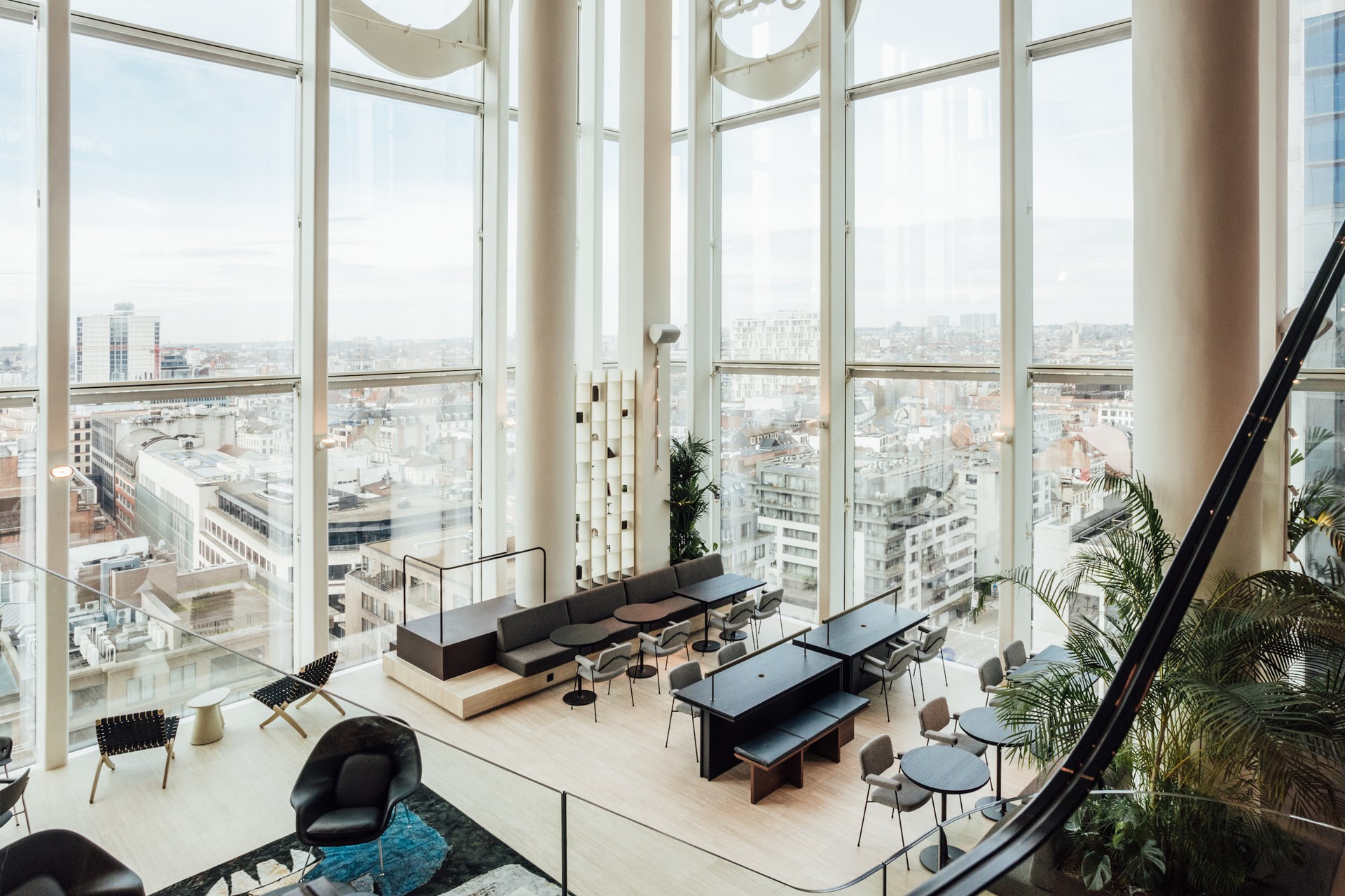Dat dit niet het doorsnee Brussels kantoor is wordt duidelijk zodra je als bezoeker uit de lift stapt. Op de 14e verdieping van het prestigieuze Manhattan Center in Brussel verwelkomt een met licht overspoeld atrium werknemers en bezoekers als gasten in een hotellobby. De overvloedige aanwezigheid van planten en groencorners creëren een wintertuingevoel dat de ruimte een hoge welzijnsfactor geeft.
