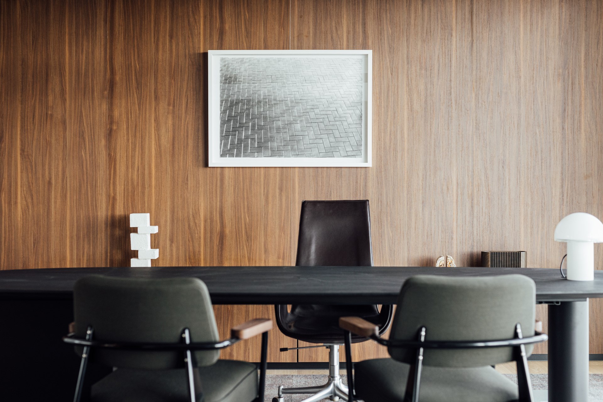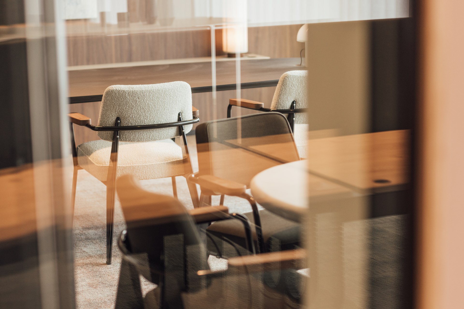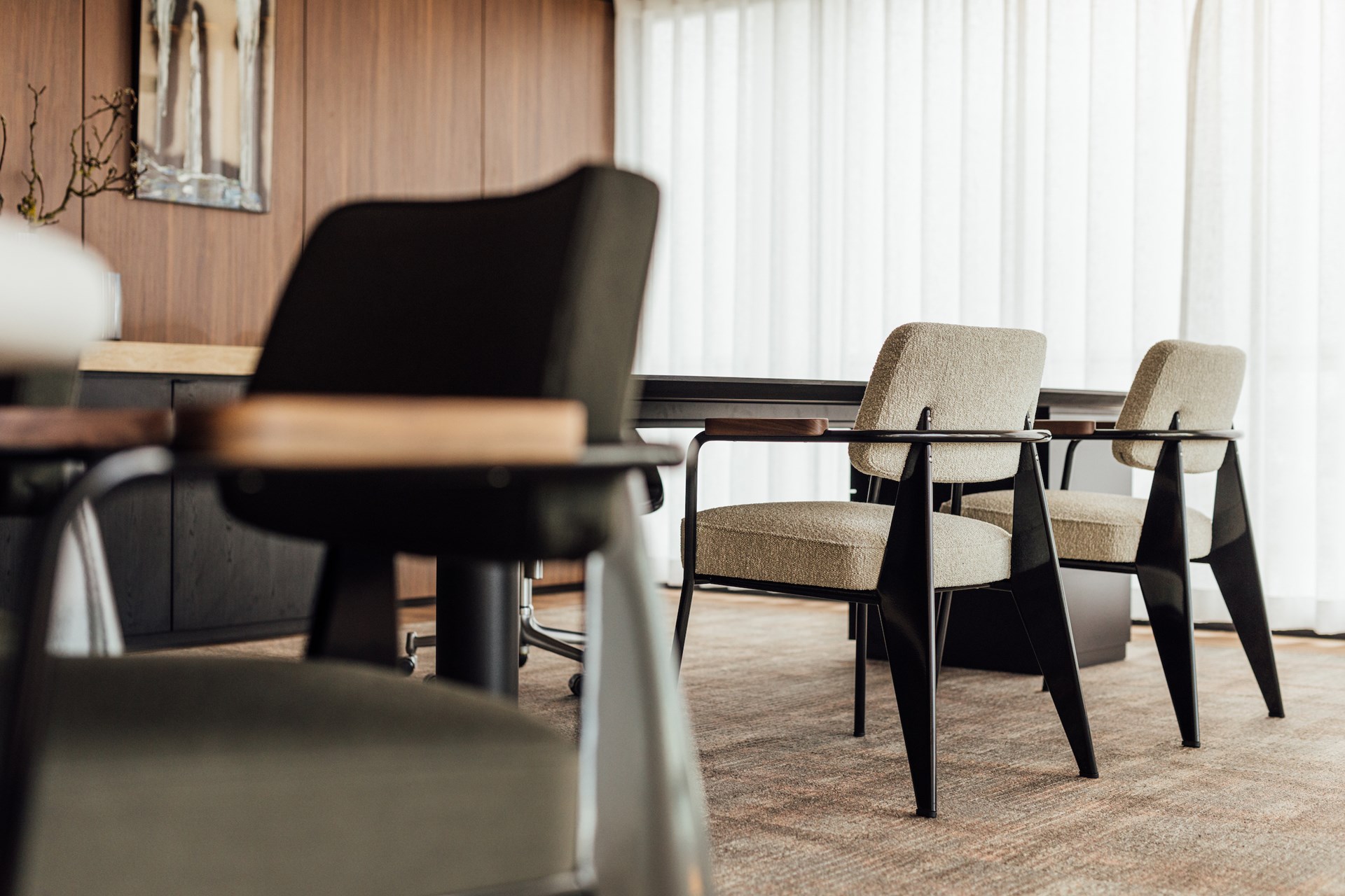 Dat Ageas CEO Hans de Cuyper oog heeft voor kunst en design wordt duidelijk in de meubelselectie. Op deze plek geen anonieme kantoorstoelen, maar een combinatie van vintage en hedendaags design. Alles wat niet door Creneau op maat gemaakt is, heeft een signatuur. Van het duo Saarinen Whomb chairs dat je verwelkomt in het atrium, de prachtige jachtgroene Prouvé stoelen in de meetingrooms, tot de Paulin Tulip chairs van Artifort die rond de receptietafels op de bovenste verdieping staan: alles getuigt van een bewuste keuze voor tijdloos design.