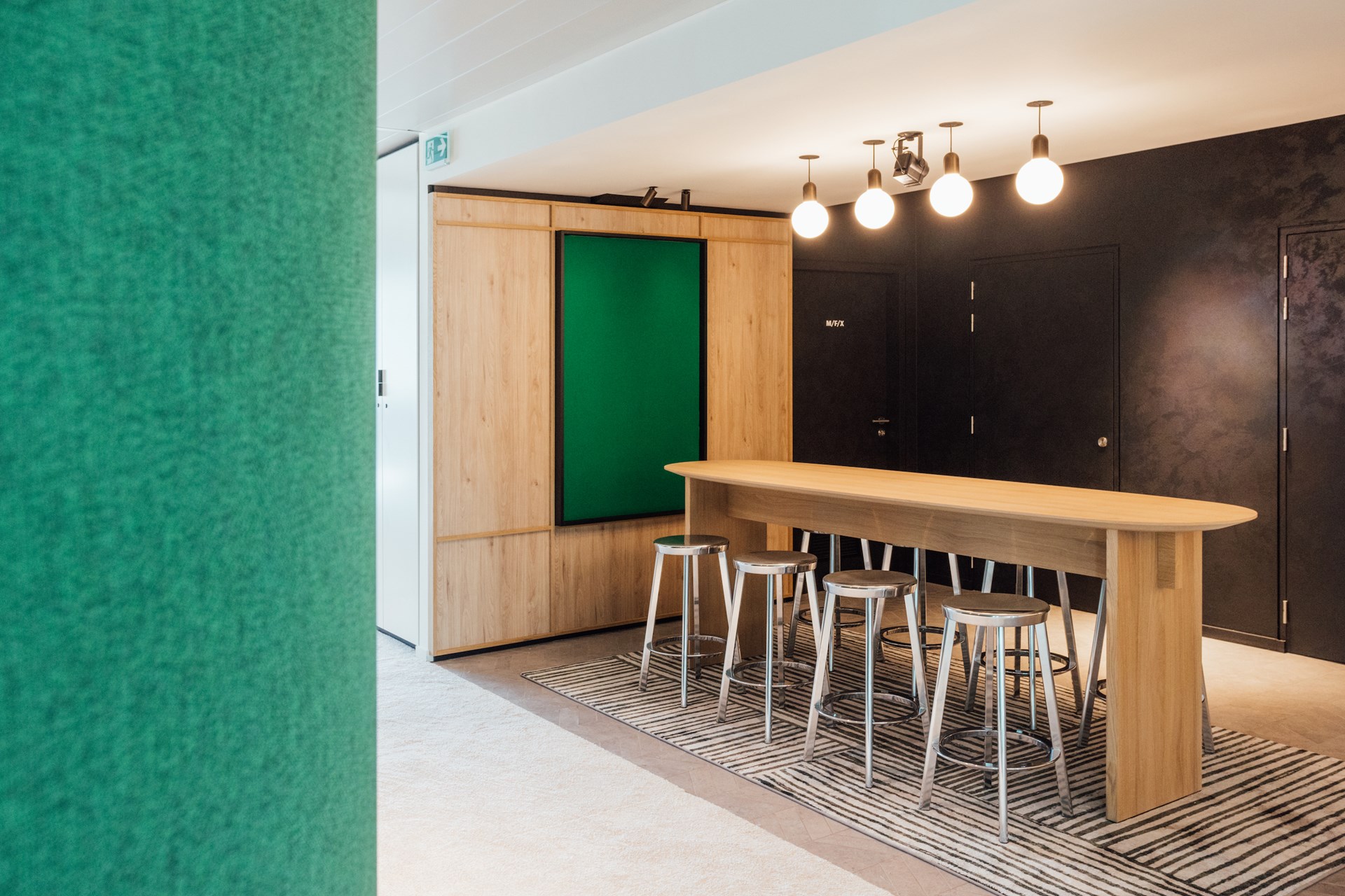 Het thuisgevoel wordt verder versterkt door een residentieel materiaalpalet bestaande uit hout, natuursteen en stoffering. De alomtegenwoordige indirecte verlichting zorgt voor een aangename en gezellige sfeer. Enkel op de werkplekken zelf wordt de standaard van 500 lux geïmplementeerd.