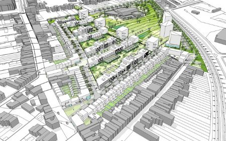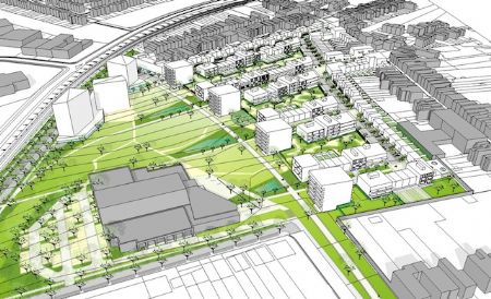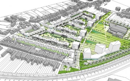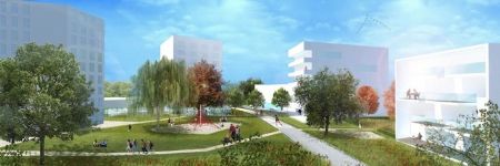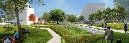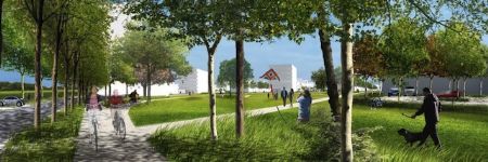 De spoorweg zal verdwijnen achter 3 park-torens die de westelijke rand vormen van het park