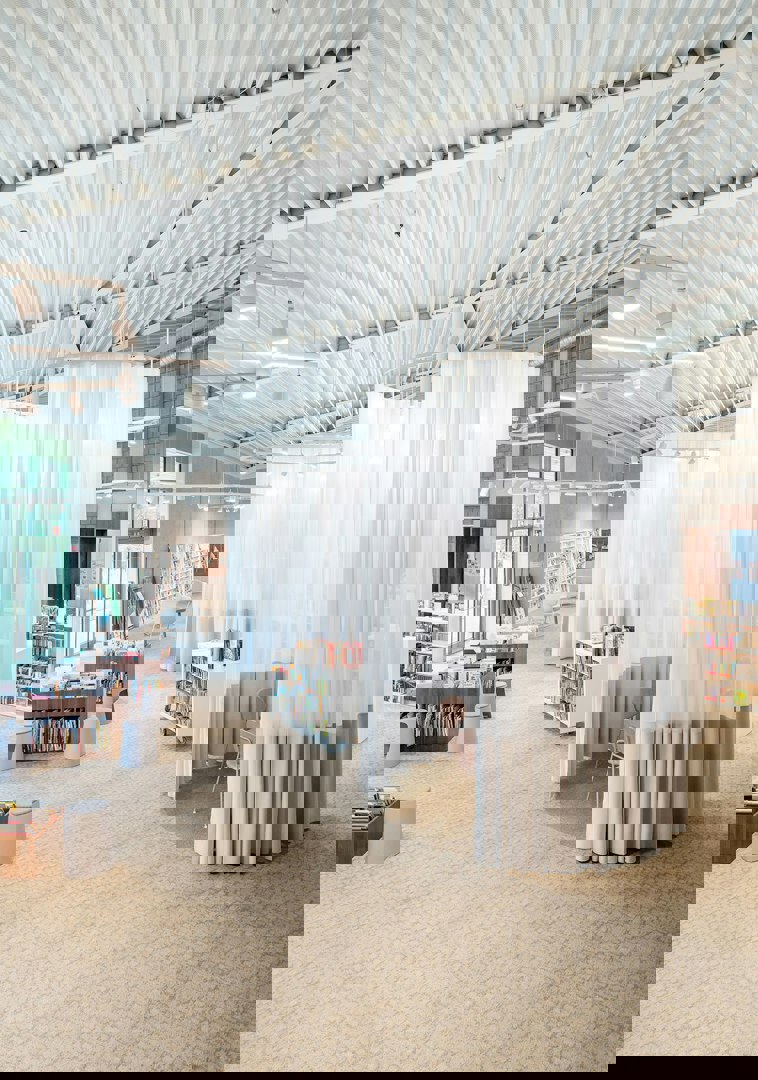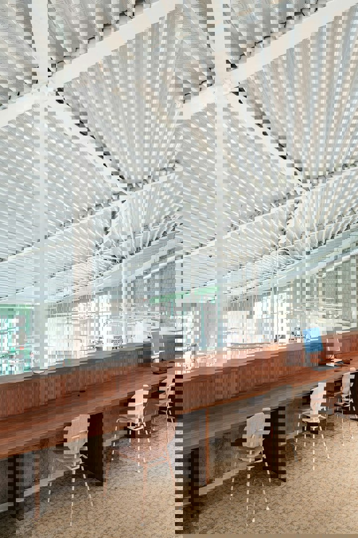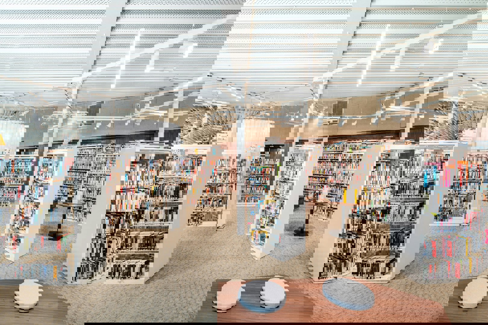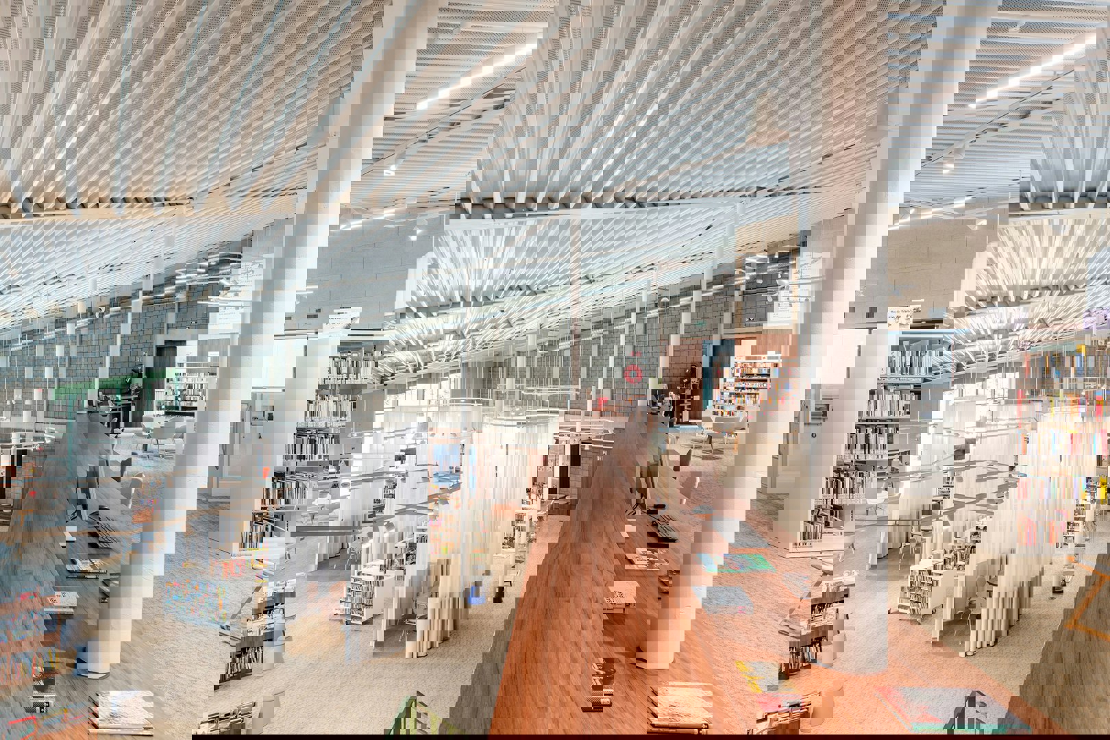 De functies zijn zo georganiseerd dat ze efficiënt samenwerken en akoestisch gescheiden blijven. De bibliotheek en de zalen hebben elk een eigen ingang, terwijl ondersteunende functies rond de polyvalente zaal zijn geplaatst om geluidsoverlast naar de buurt te beperken. Brede gangen werken als akoestische buffer tussen de zones, waardoor verschillende activiteiten gelijktijdig kunnen plaatsvinden zonder elkaar te storen. Deze opzet zorgt voor een flexibele inzet van het gebouw, geschikt voor uiteenlopende evenementen.