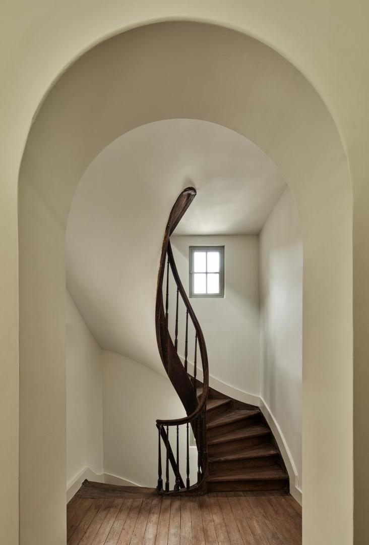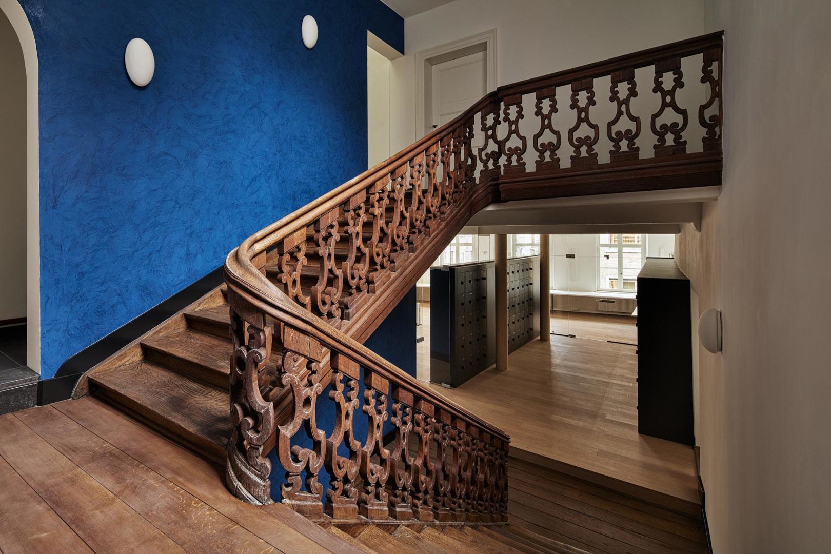 De nieuwe trappenkern krijgt daarbij een duidelijke signaalfunctie. Als afzonderlijk volume maakt ze de toegang tot het gebouw leesbaar en herkenbaar voor gebruikers. Tegelijk wordt het historische gebouw zo weinig mogelijk belast met ingrepen, doordat de circulatie buiten het bestaande volume wordt georganiseerd.
