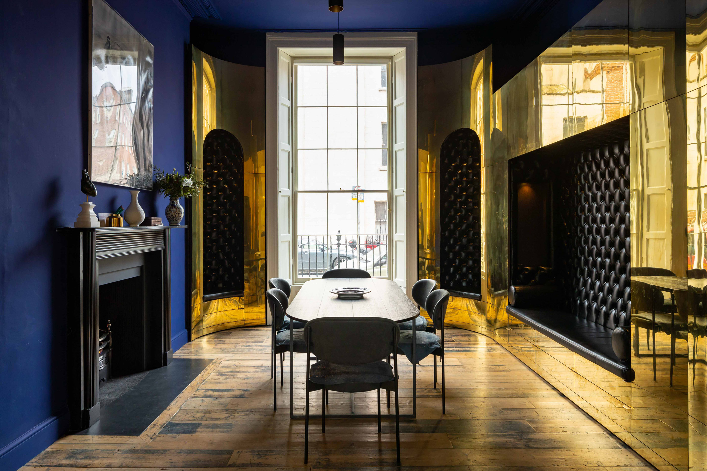 In het D2 Townhouse speelt contrast de hoofdrol. De flamboyante elementen steken af tegen de ingetogen details. Neem nu de leefruimte. Die is omringd door een glanzend, architectonisch meubel gemaakt van messing. De gouden tint komt goed tot zijn recht dankzij de sobere donkerblauwe muren. Het doel hiervan is meer ruimtegevoel creëren.