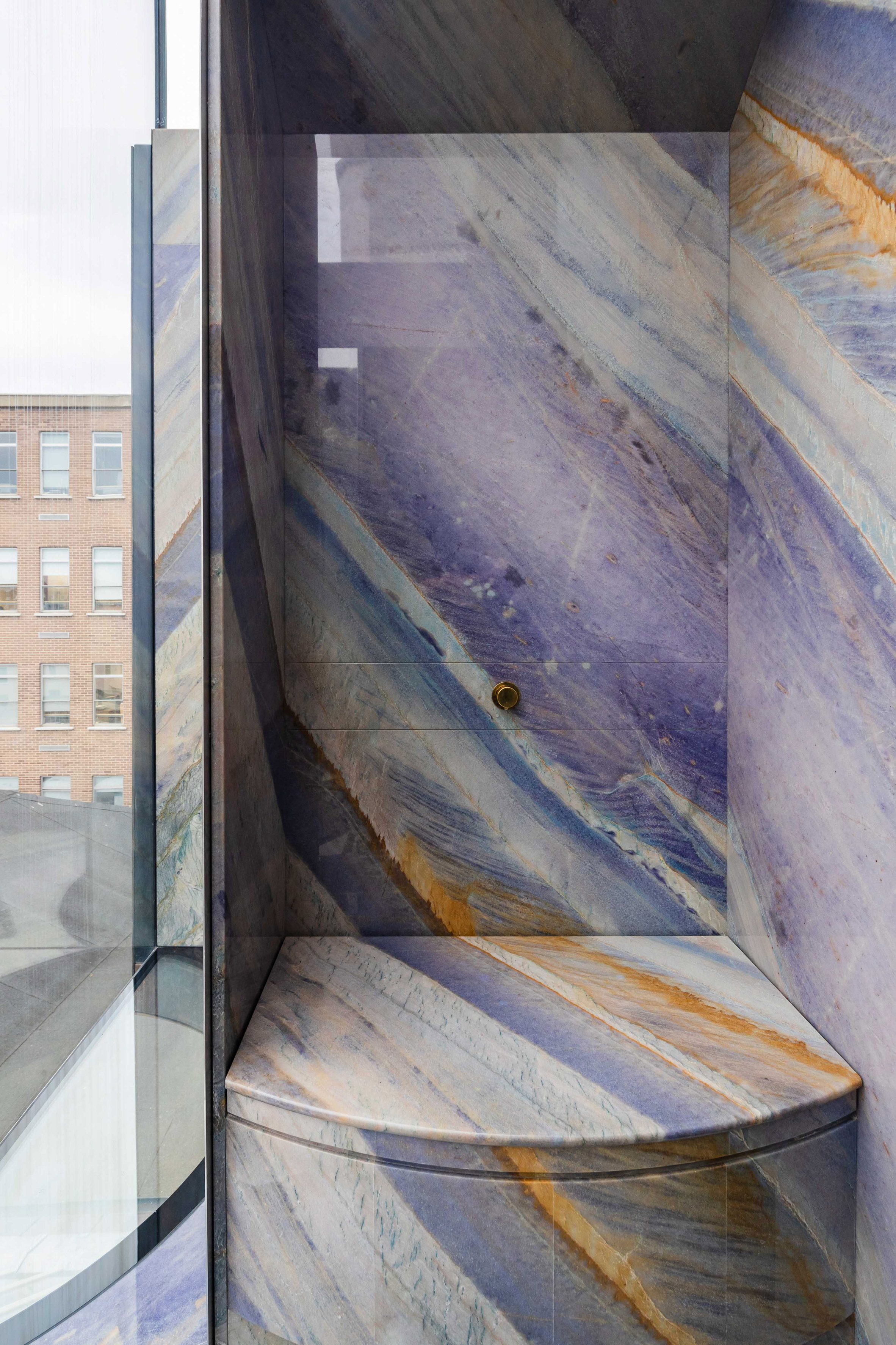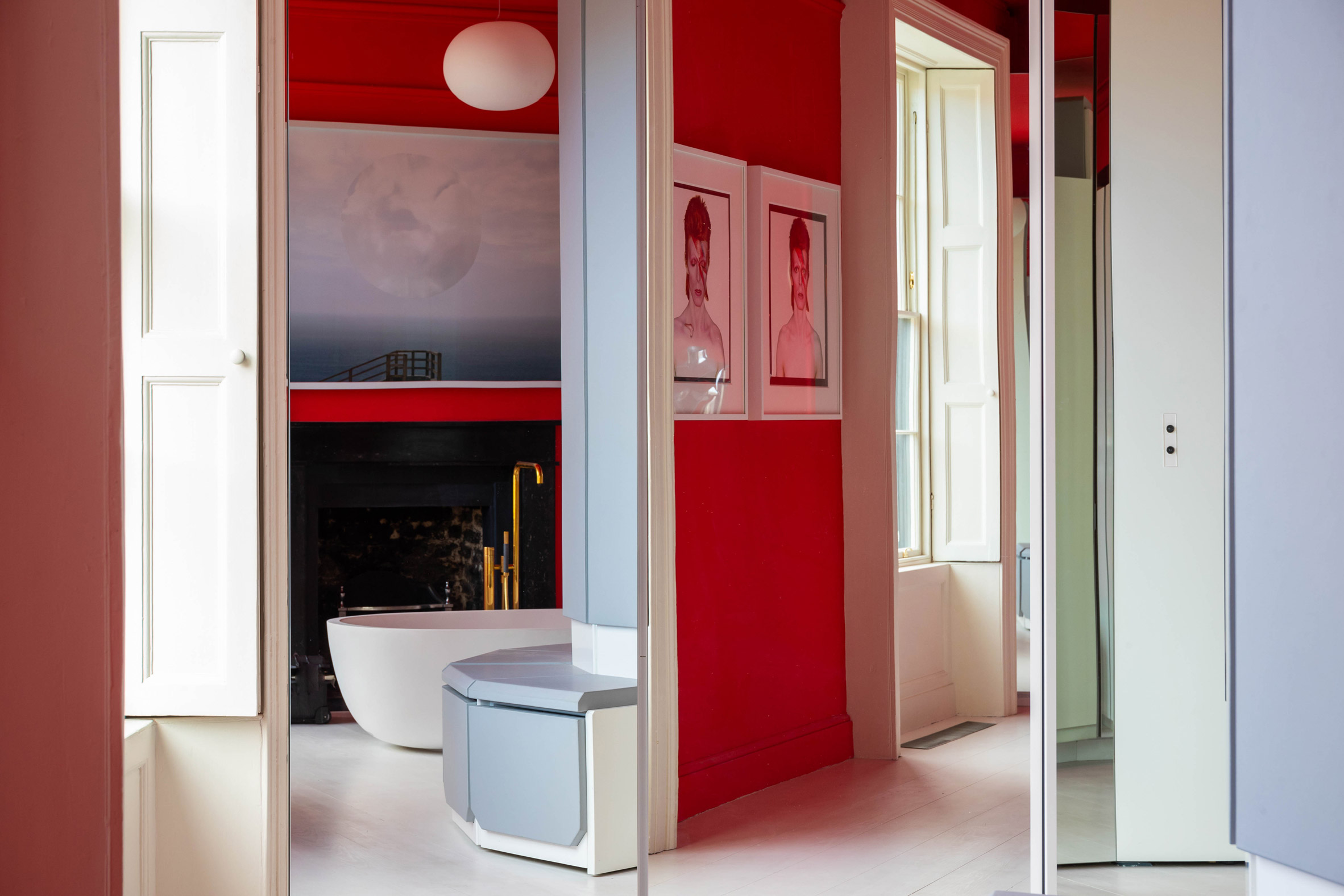 Verder is de woning voorzien van meerdere badkamers. In het exemplaar onder de trap installeerde Moulson onyx panelen om een soort van “bubbeleffect” te creëren. In een andere sanitaire ruimte op de bovenverdieping gaan de roze fluorescerende bekleding en het witte oppervlak rondom de wastafel met elkaar in dialoog.