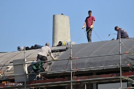 Dakwerker Benny Vanherle kreeg de opdracht om de renovatie van het dak uit te voeren. “Door de vorm van het dak was het geen sinecure,” herinnert Vanherle zich. “De gebogen structuur liet niet toe om erop te lopen, zodat we via stellingen, ladders en ander hulpmiddelen dit project tot een goed einde moesten brengen. Dat het om een geklasseerd monument ging, verhoogde de moeilijkheidsgraad.”