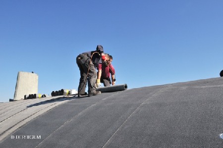 “Concreet hebben we voor dit project eerst de isolatie mechanisch bevestigd. Daarna werd als onderlaag gekozen voor Derbicoat NT, om vervolgens als bovenlaag Derbicolor aan te brengen. Die twee lagen werden gelijmd met de koudlijm Derbibond NT. Dat ging perfect.”
