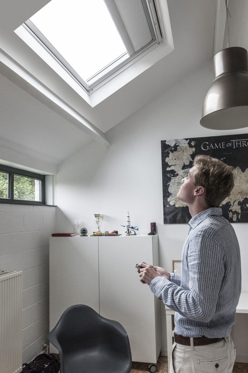 Om de werken in goede banen te leiden, deed Valérie een beroep op een ervaren team van dakdekkers, Toitures Fauconnier SPRL. "De vorige VELUX-dakvensters waren 20 jaar oud, klein, manueel bediend en slecht geïsoleerd. Om van meer daglicht in de kamer te kunnen genieten, adviseerden we te kiezen voor grotere, beter geïsoleerde en elektrische dakvensters ", zegt werfleider Thierry Fauconnier.
