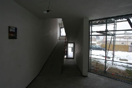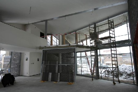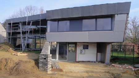 Schuine voorgevel met sandwichpanelen 10cm PUR, waarachter 18 cm PUR-isolatie. Tegen de sandwichpanelen zijn natuursteenplaten bevestigd (werken nog in uitvoering).