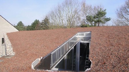 Een groendak werd aangelegd op de hellende dakvlakken (10° aan de straatzijde, 15° achterzijde). Voornaamste functie is de buffering van het regenwater, daarom wordt dit ook gesubsidieerd. Door de aanleg van een bloemenweide verhoogt het dak de natuurwaarde van de omgeving. De bloemenweide zal vlinders, insecten en vogels aantrekken en heeft een positief effect op het fijn stof in de lucht wordt opgenomen.