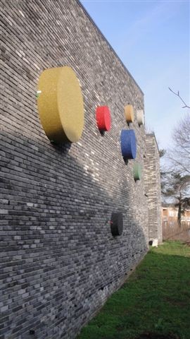 In de rechterzijgevel zijn zeven uit de gevel stekende ronde ramen geplaatst. Ze zijn afgewerkt met gekleurd gebroken spiegelglas, met een kern van 12cm PUR-isolatie, een eigen ontwerp. Doordat er enkel gekleurd licht binnenvalt is de privacy van de buur gewaarborgd.