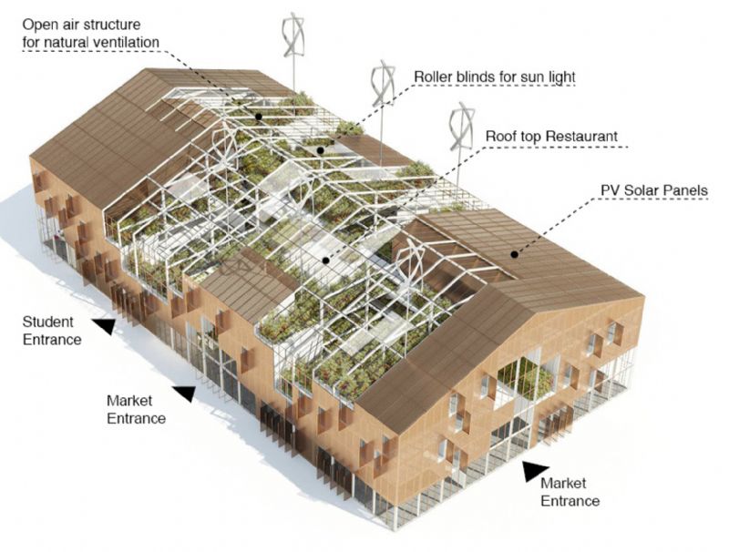 Het project biedt een uitstekend positieve-energie-gebouw waarvan het ontwerp gebaseerd is op de principes van circulaire economie. Het illustreert sprekend hoe we op een en dezelfde plaats kunnen leven, produceren, stockeren en verkopen, waarbij de vitale behoeften van de verschillende functies van het project verzekerd worden en een harmonieuze wisselwerking met de stedelijke context tot stand wordt gebracht. Het project werd bovendien ontwikkeld als een openluchtruimte zodat elementen zoals de zon, de wind, de koude en de regen op een natuurlijke manier kunnen bijdragen aan de doelstellingen van stedelijke agricultuur.