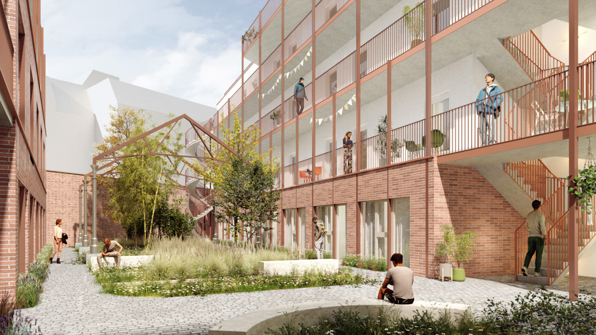 Het gebouw is ontworpen in een U-vorm die zich volledig opent rond een grote, groene binnentuin. Die buitenruimte fungeert als het sociale hart van de residentie, waar studenten buiten kunnen studeren op een bankje, kunnen sporten of simpelweg op adem komen tussen de lessen door. Centraal in de tuin staat een pergola die is vervaardigd uit de hergebruikte stalen structuur van de oorspronkelijke loodsen. De aanwezigheid van vele bomen en planten biedt de bewoners de nodige rust in een wijk die voorheen werd gedomineerd door de logistieke activiteiten van de nabijgelegen slachthuizen en nu stap voor stap wordt omgevormd tot een volwaardige woonbuurt.