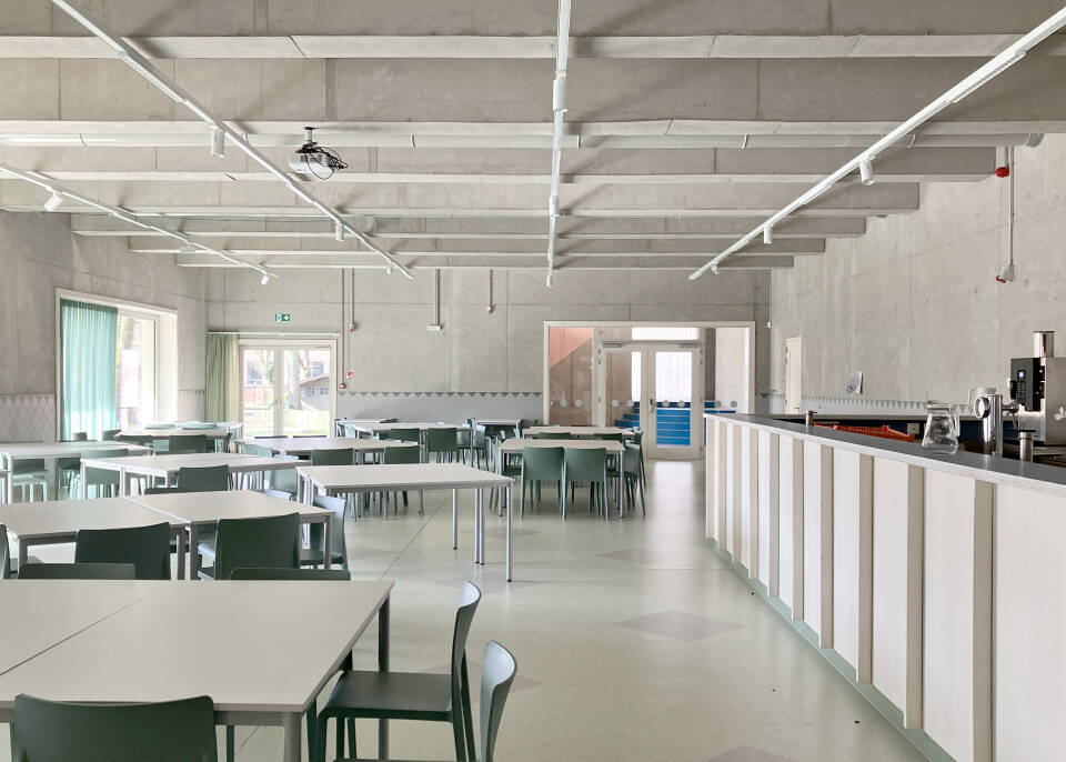 Bij de toegang tot de nieuwe vleugel is een overdekte buitenruimte in de bouwmassa geïntegreerd die fungeert als beschutte verzamelplek. De overgang tussen de straat en de tuin wordt gemarkeerd door drie nieuwe bomen die aan de zuidelijke gevel zijn geplant. De nieuwe bomen dienen als natuurlijke zonwering tijdens warme periodes. Door die bomen te combineren met de oude bomen die al op het terrein aanwezig waren, ontstaat een gelaagd uitzicht. Die inrichting versterkt de visuele as tussen de straat en het binnengebied en zorgt ervoor dat er tussen de gesloten gevels van de drukke straat een groen rustpunt ontstaat. .