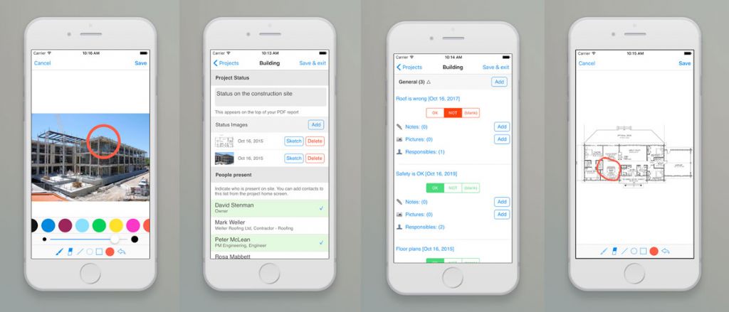 - Noteer opmerkingen en vul aan met verantwoordelijken, foto’s en schetsen, locaties op grondplannen … met de ArchiSnapper App op de werf