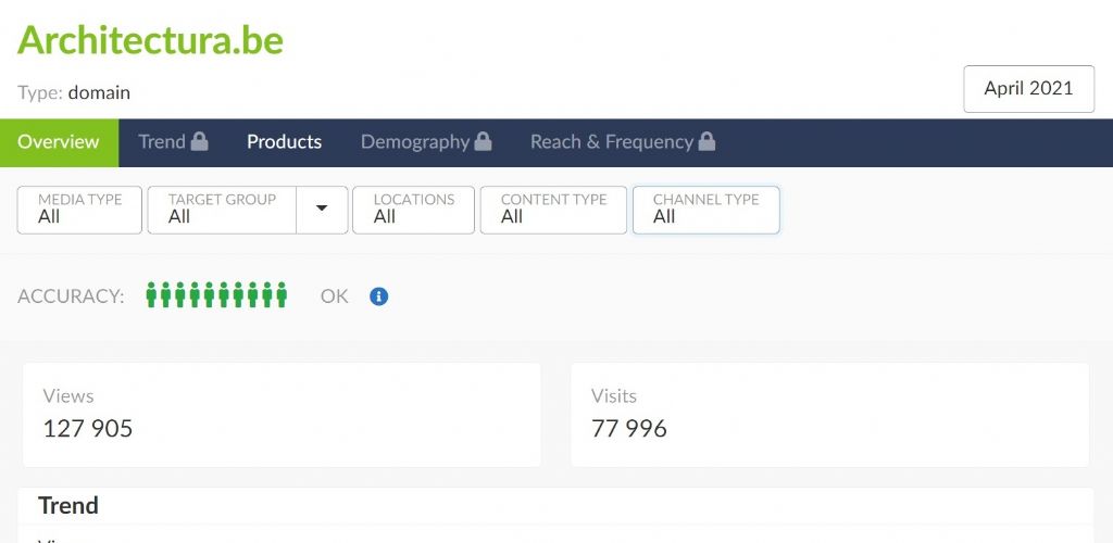Omdat we bij architectura.be transparante en eerlijke communicatie hoog in het vaandel voeren, laten we onze bezoekersaantallen controleren door de onafhankelijke organisatie CIM. We zijn daarmee de eerste b2b-website voor de bouwsector die zijn bereik laat meten door CIM. April 2021 was de eerste volledige maand waarvan we onze CIM-cijfers kunnen delen. De cijfers zijn niet identiek maar liggen wel volledig in lijn met onze cijfers van Google Analytics. In april 2021 kon architectura.be rekenen op 127.905 pageviews en 77.996 visits. Cijfers waar we als nichesite best trots op mogen zijn.